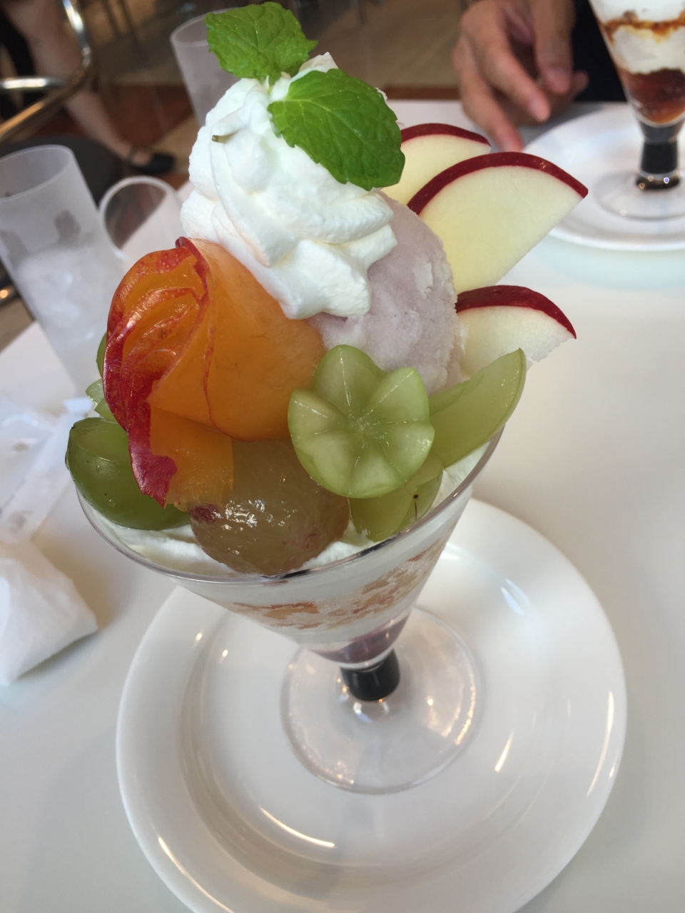 マスカットのフルーツパフェを食べました。入る前は行列になっていて、20分くらい並びました。テーブルに乗ったフルーツパフェは見た目も美しくて、味はとても美味しかったです。フルーツが甘くてアイスの味にも負けてません。デザートの方しか利用したことがないので、今度は食事で利用したいです。