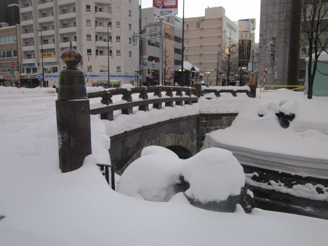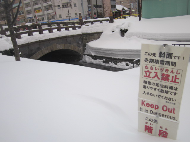 ただここは、冬季の積雪状況によっては、ちょっと危険を感じることもあり、特に無雪期ですと、創成川沿いに階段が整備されていて、河畔に降りた部分沿いを歩けるようになっているのですが、冬場はこれが完全に雪に埋もれてしまっています。無雪期の光景をご存知の方なら、ここに階段があってガクッと落ち込んでいる、ということは想像できるかと思いますが、それを知らない方が、雪を見てはしゃいでいて転落、なんて事故も実際に起きているようですので、くれぐれもお怪我なさいませぬよう、積雪期は雪道の踏み跡を外さずに付近を歩くように心掛けて下さい。