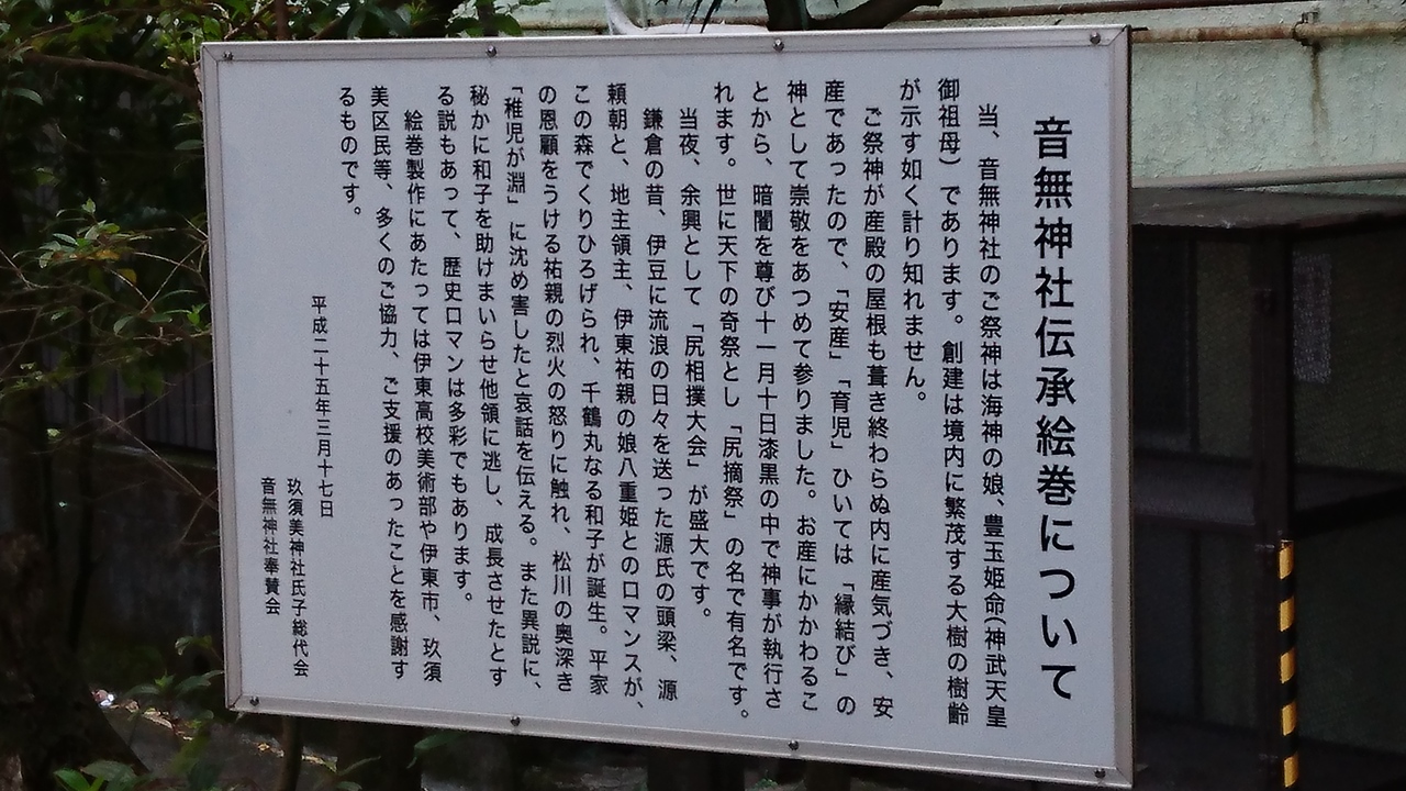 毎年秋に開催される尻相撲のルーツや、音無神社に関わる文献や、相撲の「かわず掛け」の語源が伊東市発祥という事等、思いがけずに管理人さんにガイドをして頂けて、ちょっとした時間潰しがてらに立ち寄った神社で、有意義な時間を過ごせました。