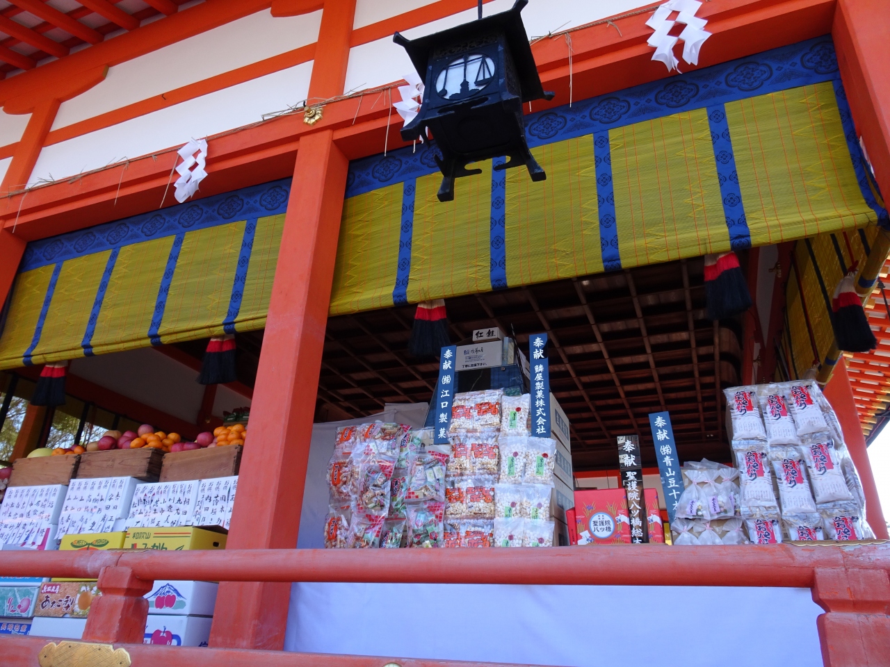 本堂手前には、大手企業が自社製品を並べてヒット祈願。