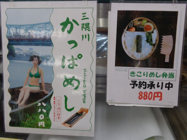 観光宣伝のテレビCM有名なかっぱに由来した、かっぱめしは売り切れでしたので、きこり弁当を買いました。