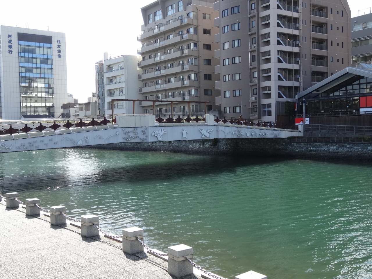徳島駅からも歩いて行ける、市内の中心を流れる川にかかける橋です。欄干には徳島らしい、阿波踊りの像が設置されていて写真を撮る観光客も見かけます。この橋以外にも夜にはライトアップされることもあるので、夜の光景もまたおすすめです。