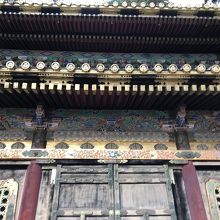 屋根瓦を挟んで一層目と二層目の彫り物は、挟まれた瓦の色が、より一層色鮮やかさを引き立てているように見えた。