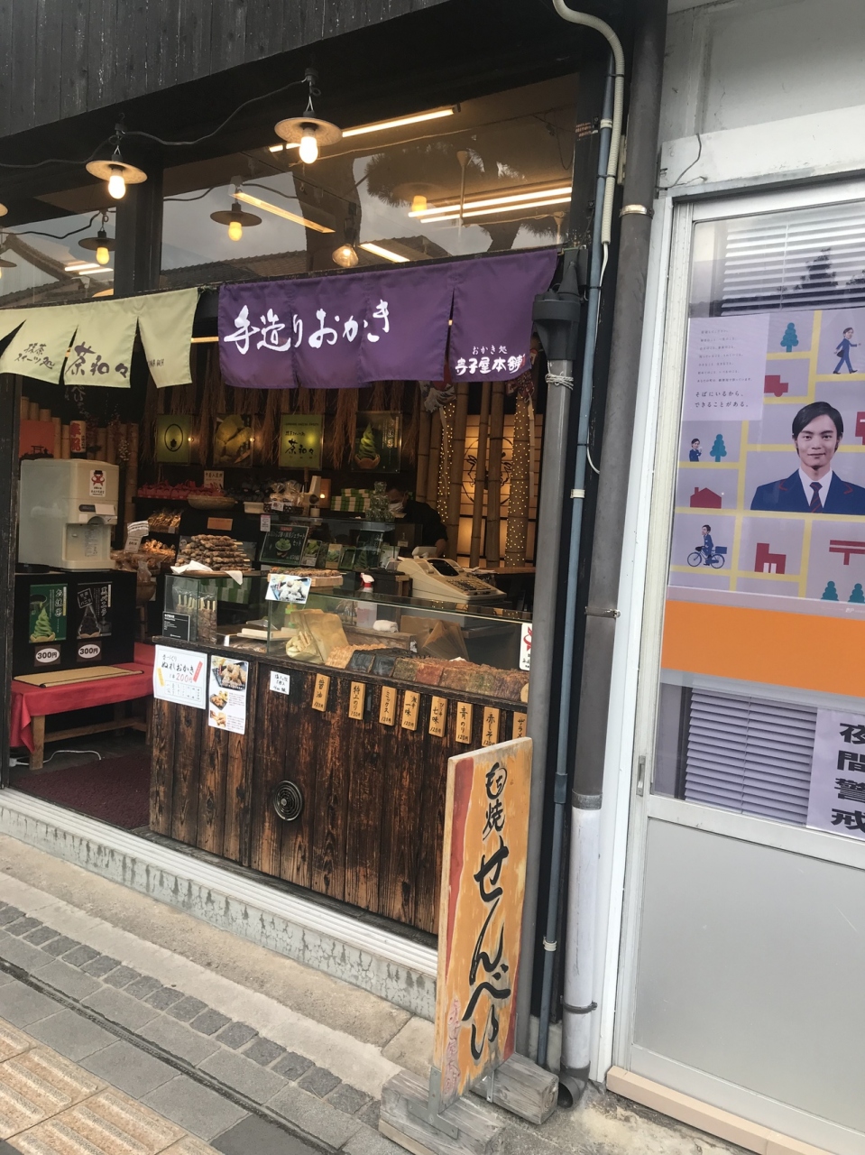 出雲大社前の山道中ほどにある、寺子屋本舗さんは一枚からおせんべいを販売しているので、食べ歩きをするのにちょうどよいです。おせんべいの形にも特徴があり、丸ではなく四角い形をしています。青のりが120円です。