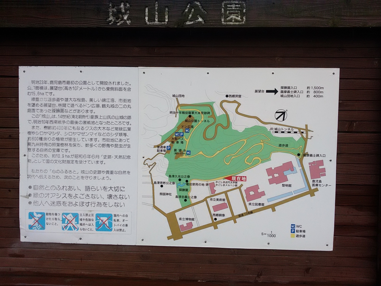 鹿児島の政治、経済の市役所を挟んだ前に在るのが城跡公園で、展望台から鹿児島市街や桜島が望めます。城山公園は高台にあり、図書館や篤姫の像などが点在して、市民もくつろぐ広場もあり、せこどんのロケにも使われたそうです。