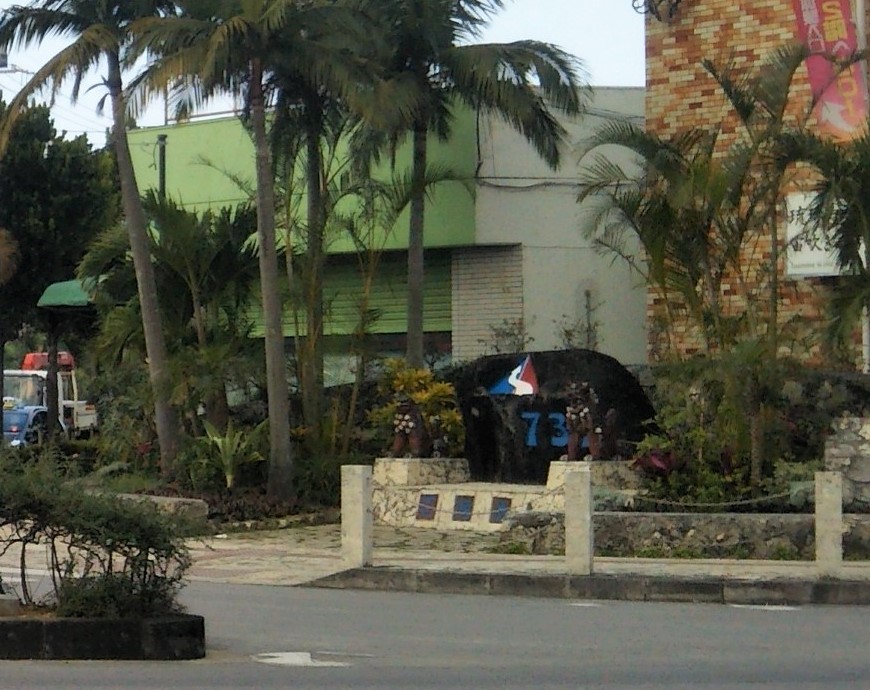 離島ターミナルを出て道なりに東へ200mほど行ったところにある大きな交差点。記念碑は、1978年7月30日の本土復帰に伴い、それまでの右側通行から左側通行に移行したことを記念してこの交差点脇に設置されたもの。記念碑と背後の塀・歩道側ベンチ部分を合せて「730シィーシィーパーク」と呼ぶそうです。