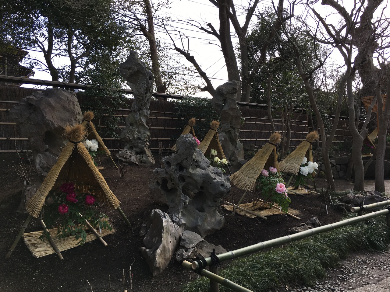 観光客が多いところちょっと離れて、500円入場料を払って中は静かでゆっくり休めます。池の外周、ぼたんの花がずらり展示されています。まだまだ寒い日の中、鮮やかなで咲いていました。ピンク、白がメインですが、黄色の黄冠も初めて見ました。冬の花の鑑賞は貴重な体験。