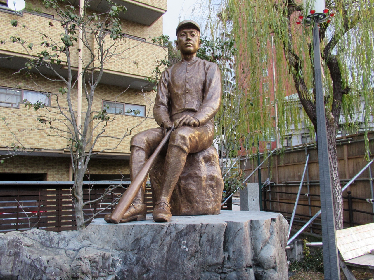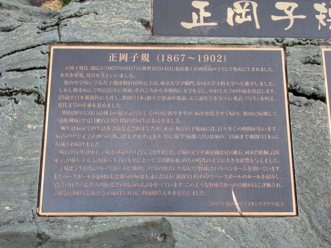 正岡子規については数十年前に中学校の国語の授業で知りましたが、習った時のイメージは野球でした。先生が野球とからめてお話しされたことは間違いないと思います。後に子規が”野球(のぼーる)”を雅号としたり、また「打者」・「走者」・「四球」・「直球」などの訳語を作り出した人物だと知った時も、何の不思議もないと思ったほどですし、平成14年には野球殿堂入りしています。大好きだった野球のユニフォーム姿の像は、本人も嬉しいのではないでしょうか。