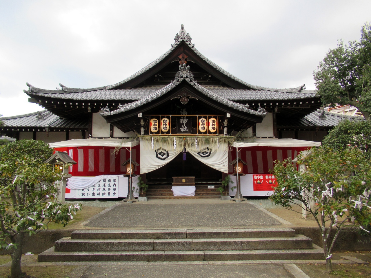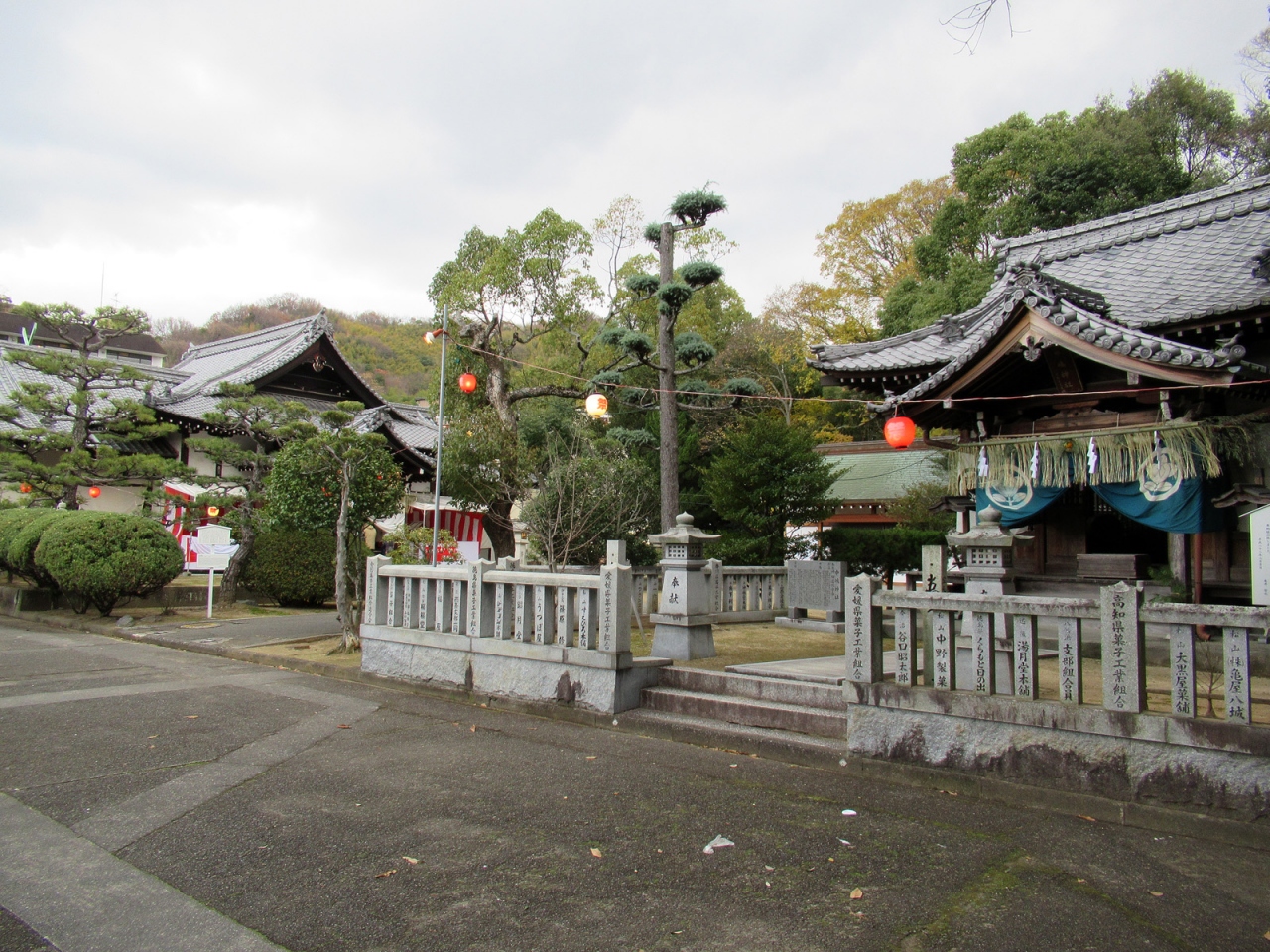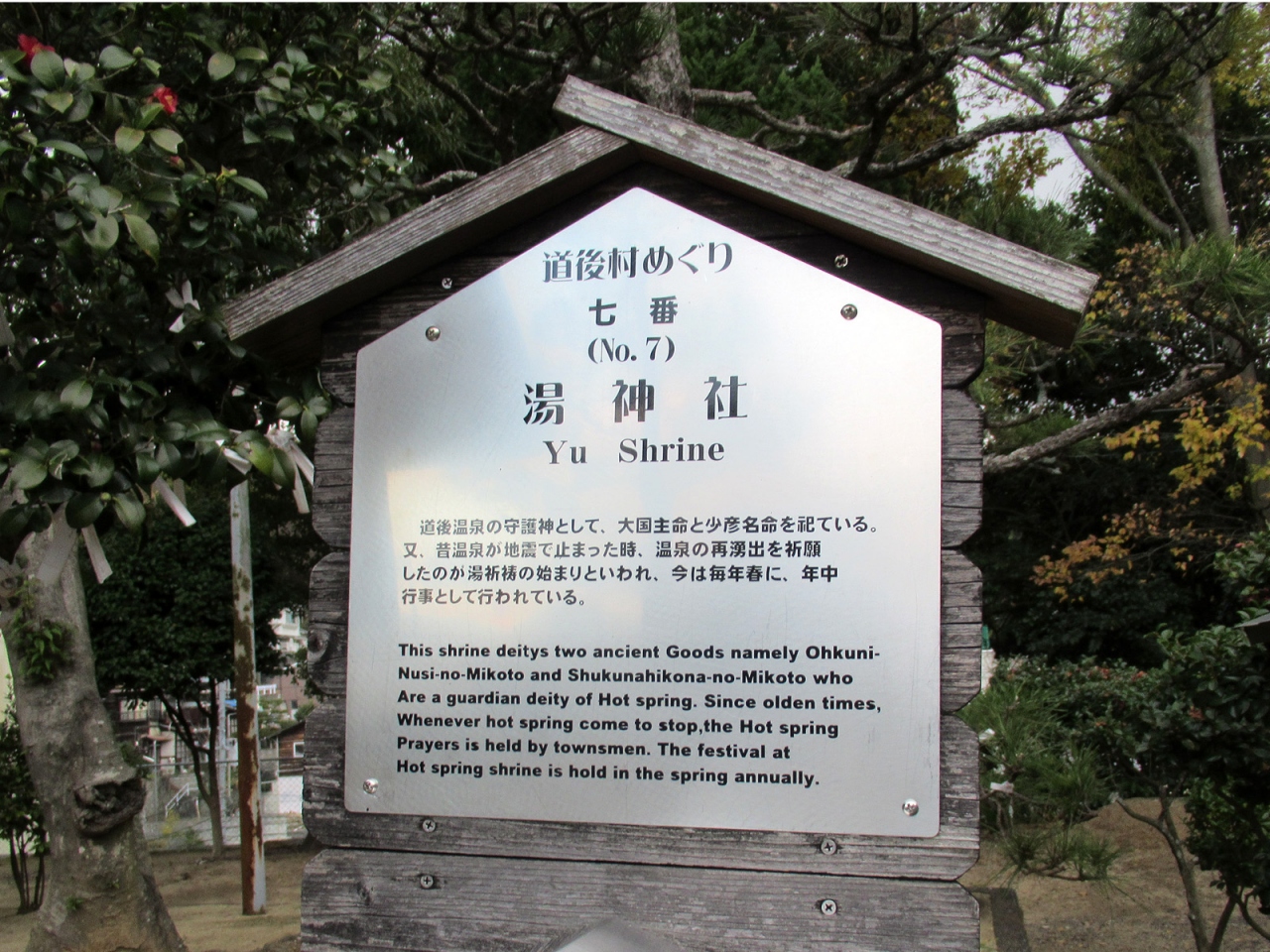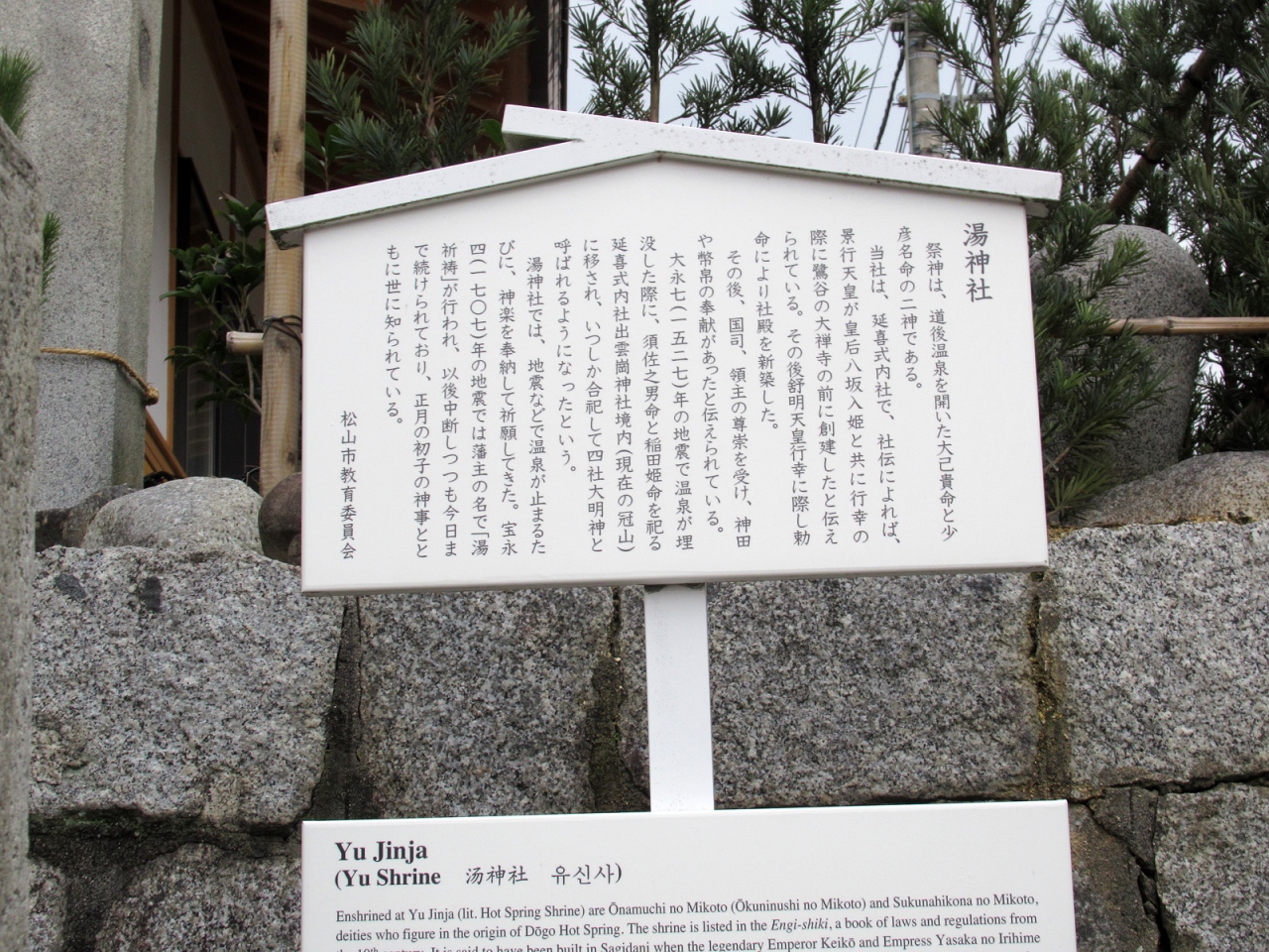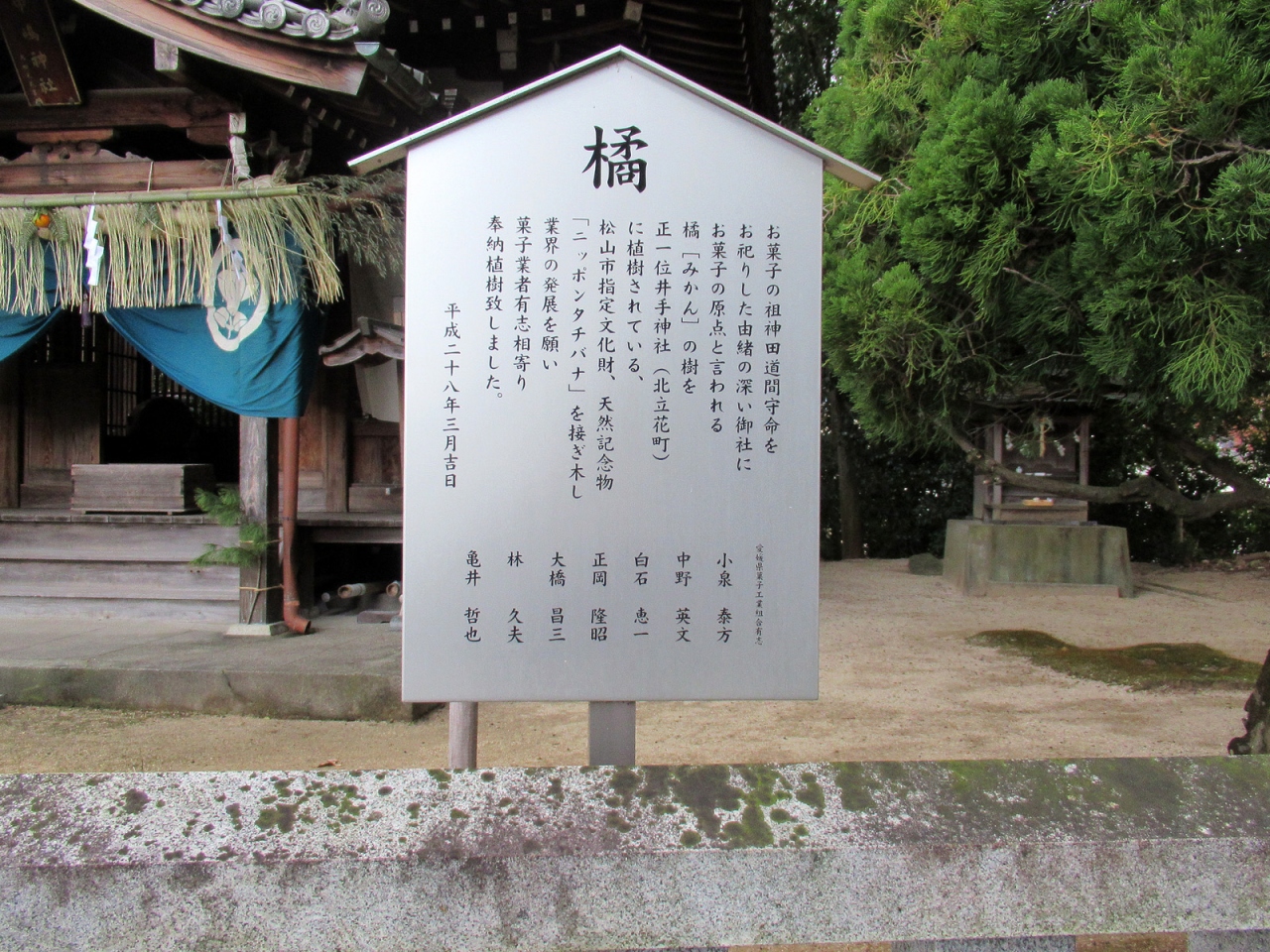 「伊佐爾波神社」へ向かう途中、「湯神社」なんて温泉地らしい神社を見つけ、寄ってみました。境内手前の境内社「中嶋神社」は、お菓子の祖先「田道間守命」をお祭りしていますが、このお菓子とは日本古来の柑橘類の橘、これも愛媛らしいです。そして「湯神社」の由緒には、大己貴命・少彦名命の二神が道後温泉を開いたとありましたが、大己貴命って出雲の大国主命の別称、そんなことされていたんですね。ともかく、とても愛媛らしい神社でした。
