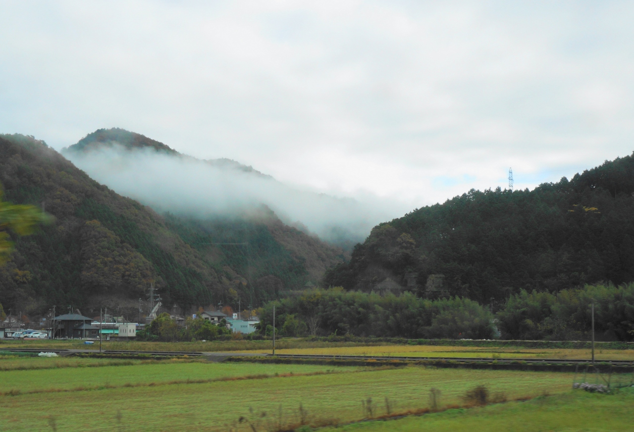車窓の景色は、山々に雲海がまとわりついて幻想的でした。