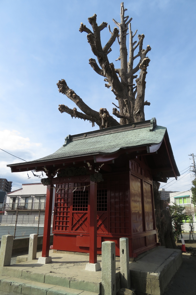 本厚木駅から10分程度でたどり着くことができます。かつての厚木宿の南の端っこあたりに鎮座しています。街道に面したところにある鳥居と本殿はこぢんまりとしていますが、もっとも注目すべきは本殿の裏にある巨木(イチョウの木)です。厚木市の天然記念物に指定されています。訪問した時期が冬なので寒々としていますが、Web上で調べてみたら、葉がある木は何倍も立派に見えました。樹齢約450年(推定)というから、江戸期からですね。枝が切られていたのが気になるところですが……。渡辺崋山が描いた厚木六勝という絵にも描かれているようです。