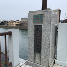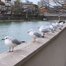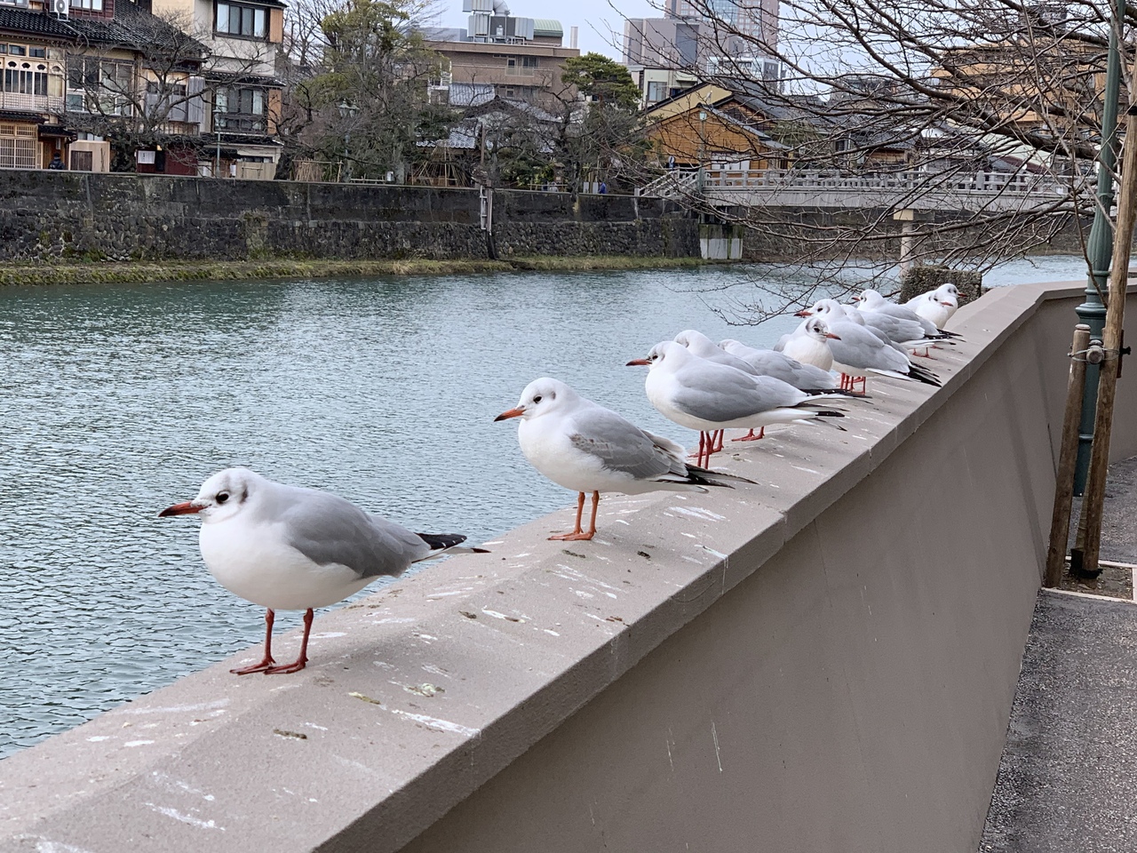 ひがしと主計町の両茶屋街を結ぶ石造りの橋で登録有形文化財に指定されています。大正11年竣工のようです。橋の上から観る川面や主計町茶屋はとても絵になっていました。桜の季節は最高でしょう。海が近いからか川にウミネコが整列する一風変わった景色です。