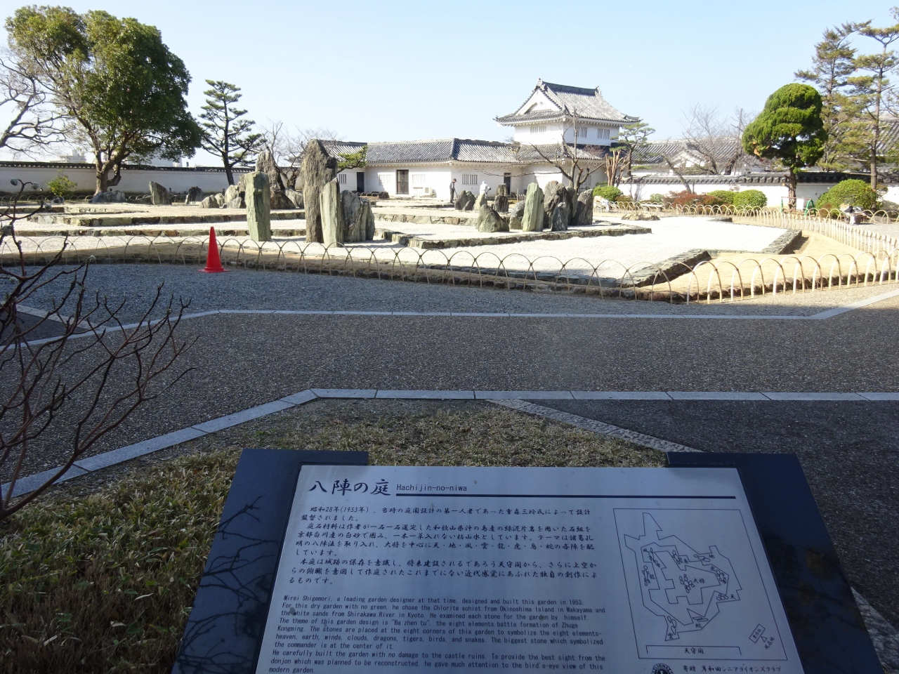 岸和田城庭園(八陣の庭)は、昭和28年に重森三玲が設計・作庭を行った回遊式枯山水庭園ですが、訪れた時は、平日のお昼前とあってか、がらがらで、係りの人たちが整備をしていました。