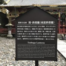日光東照宮には121個の燈籠があるが、その中でも有名な燈籠は、伊達政宗がポルトガルから取り寄せた南蛮鉄で鋳造された2期の燈籠。陽明門の手前の階段右横にある。重要文化財。