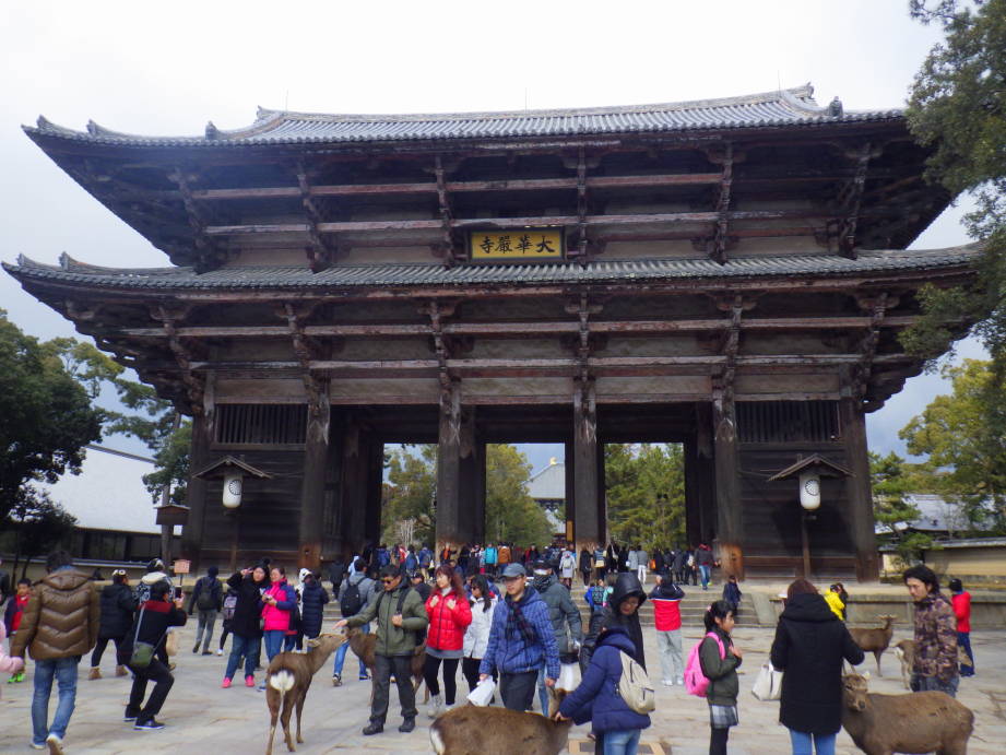 興福寺から歩いて15分くらいで東大寺の南大門に到着しました。日曜日のせいか南大門の周辺は観光客で溢れていて、シカせんべい目当てのシカもたくさんいました。シカはだいぶ人に慣れていて人を襲ったりもしていたので注意が必要だと思った。