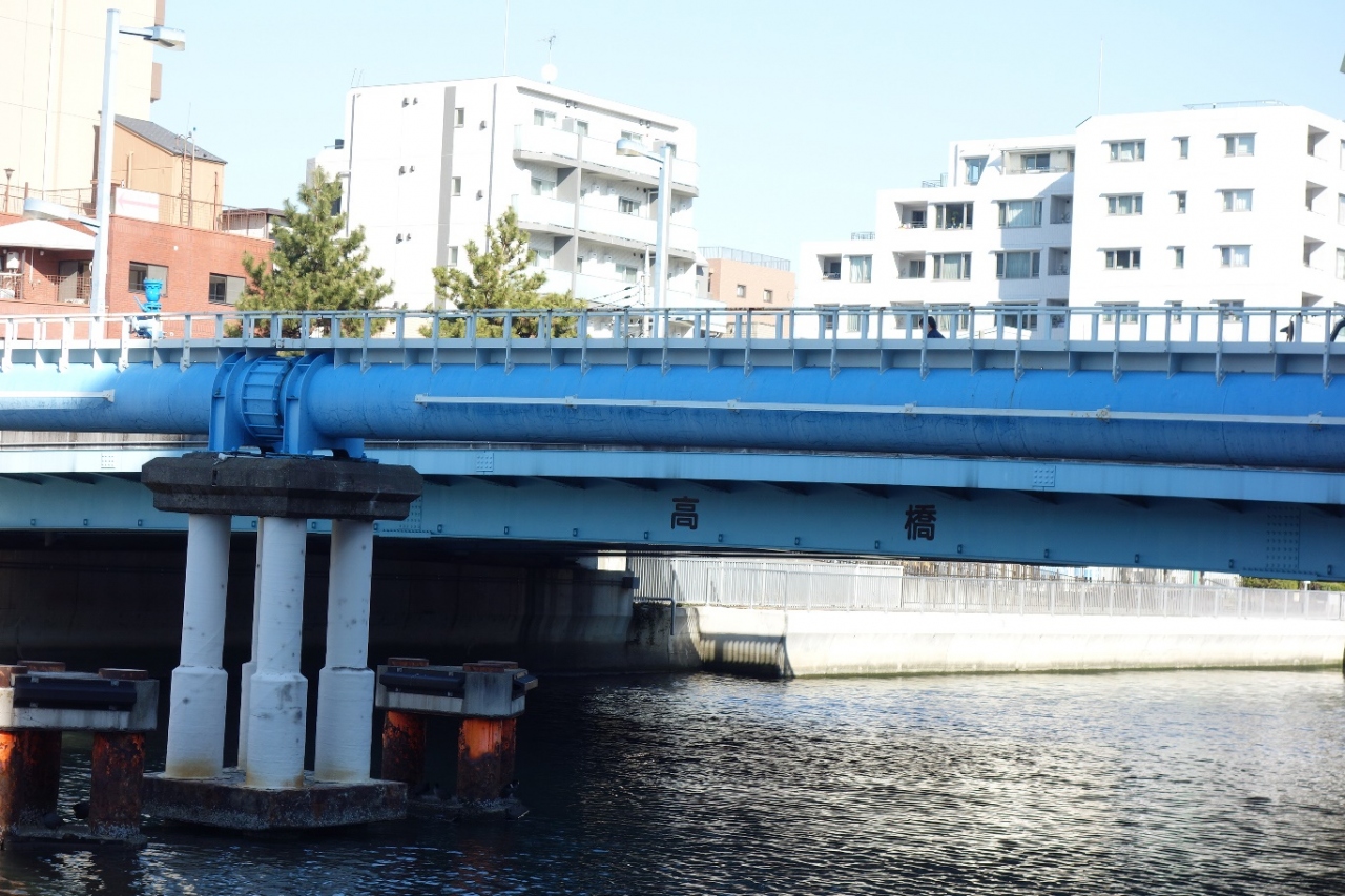 隅田川や小名木川に近いエリアを散策中こちらの橋を渡りました。高橋は小名木川に架かる橋で、隅田川に近い萬年橋、そしてこちらの高橋と続きます。萬年橋がガッチリした鉄橋なのに比べると高橋はブルーカラーの普通の橋でした。