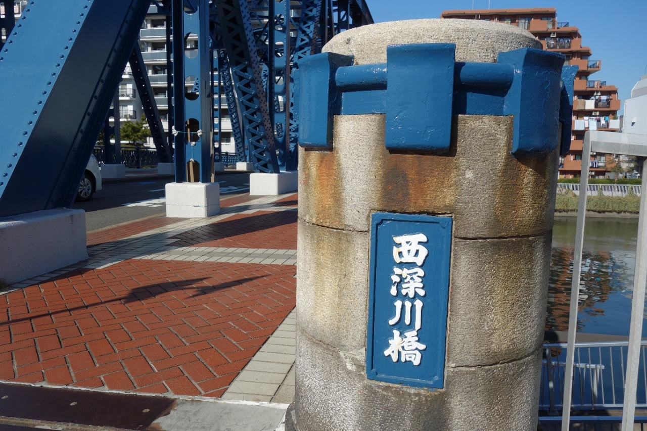小名木川に架かる橋のひとつです。隅田川に近い萬年橋、高橋、そしてこちらの西深川橋と続きます。橋は青く塗られた鉄橋でかなり重厚なイメージでした。安心して利用できる信頼感ある安定の橋、近くには大きな魚のオブジェが置かれていました。