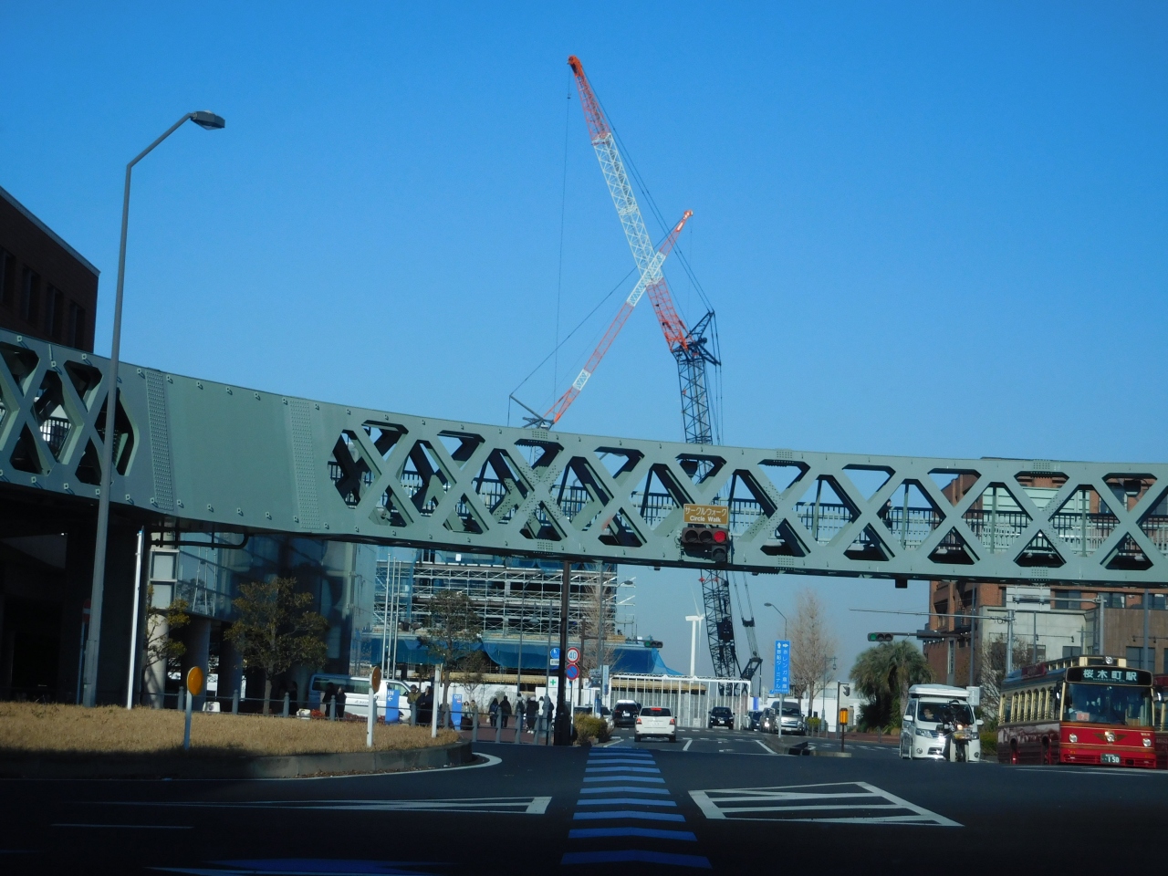横浜みなとみらいの新港地区、国際大通りと万国橋通りが交差する場所に架かる、丸い円形の歩道橋です。ちょうどドライブをしている時に、サークルウォークの交差点の信号で停まったので、サークルウォークの内側から写真を撮る事が出来ました。交通量の多い場所なので、車も人も安全に通行できるようになっていて、景観も損ねる事が無くて良いと思いました。