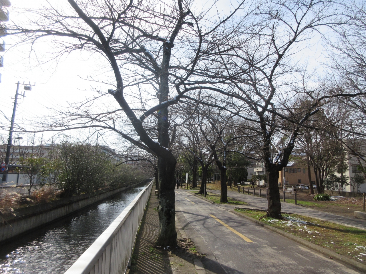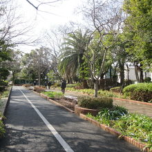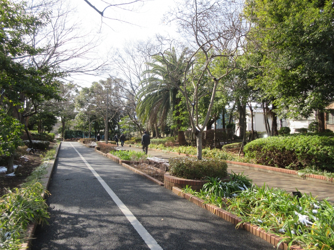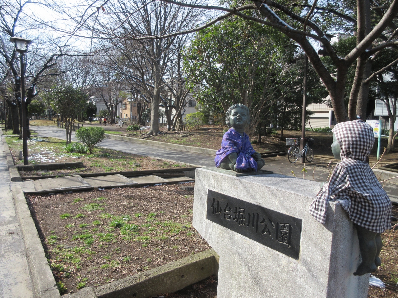 全長3700mの仙台堀川親水公園を小名木川から入ってみました。大きなヤシ、松、小さなバラ園などがある公園がありました。仙台堀川公園東交差点から仙台堀川が流れ、桜並木の遊歩道が南へ伸びていました。亀高公園近くの仙台堀川親水公園にはツルツルお山のおすべりという名のすべり台があり児童遊園の雰囲気もありました。東西に通る道路を過ぎると木々が変わり、同じ公園でも雰囲気が違うことに城東公園まで歩いて気づきました。
