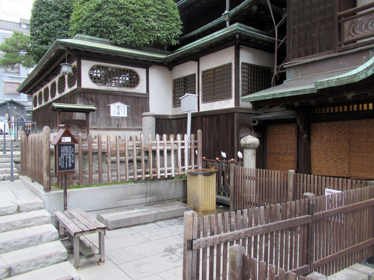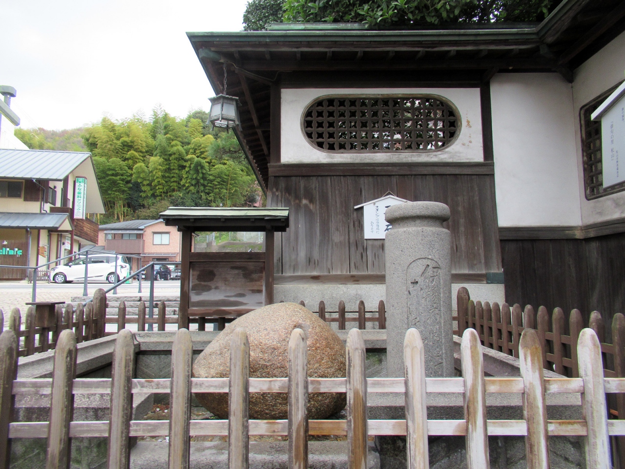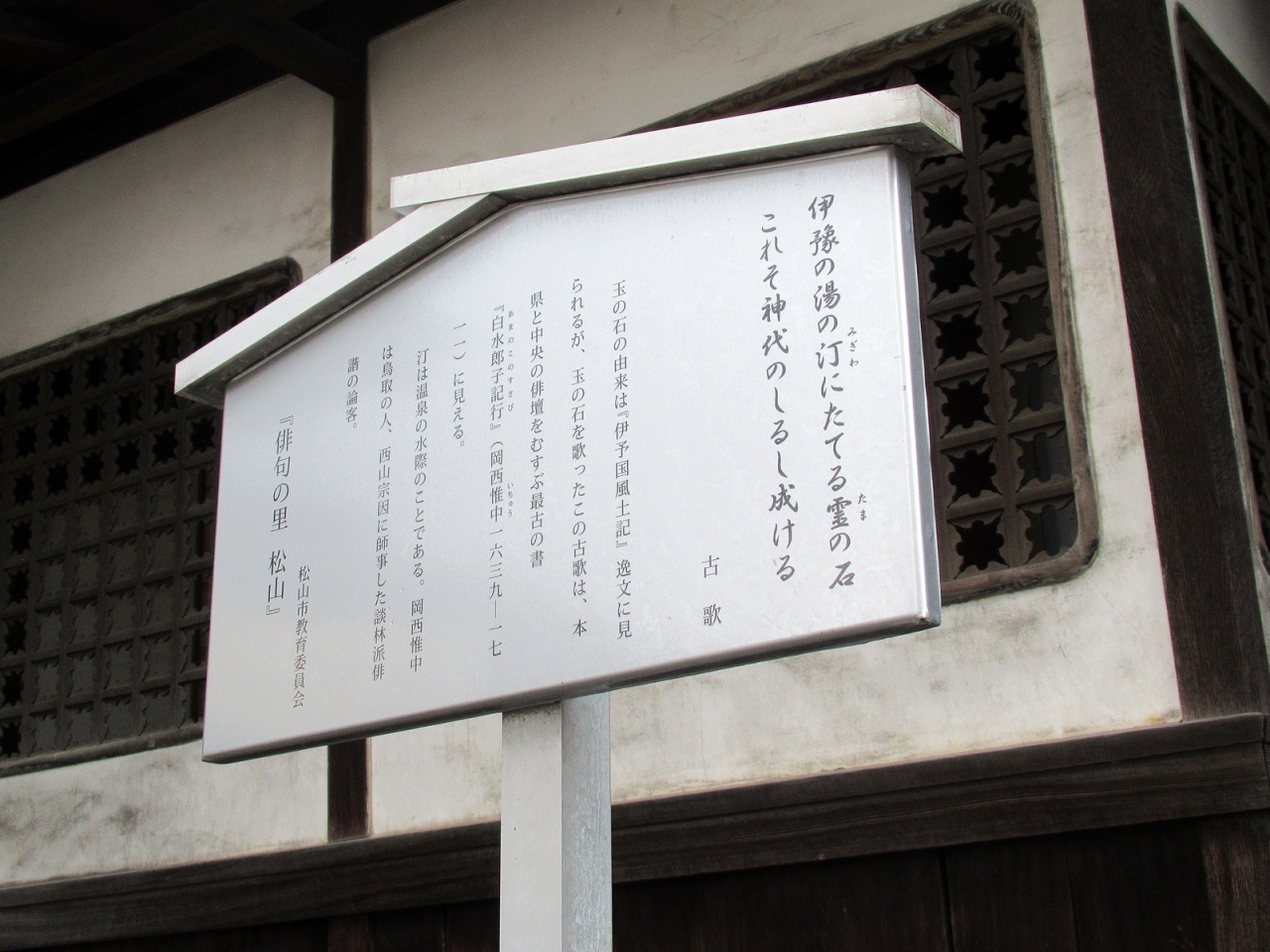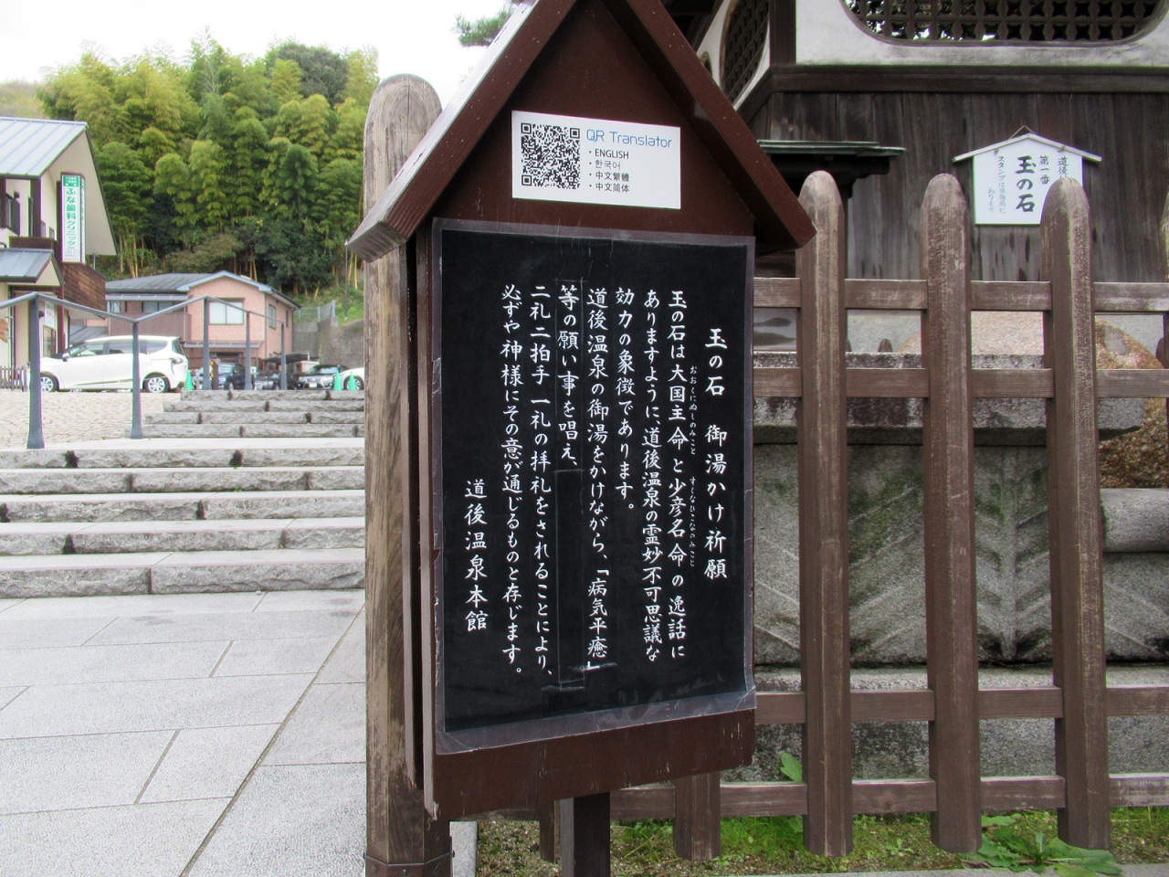有名な「道後温泉本館」、せっかく改修工事開始前に来られたので、とにかく建物をじっくりと見て回りたいと、正面向かって左側へ移動すると、その奥に「玉の石」がありました。道後温泉の名湯伝説をあらわす印のようでした。