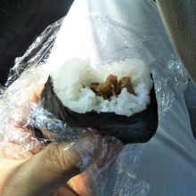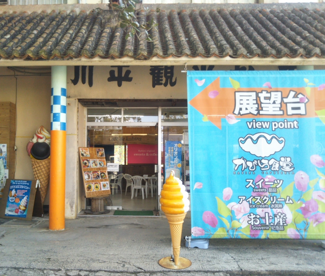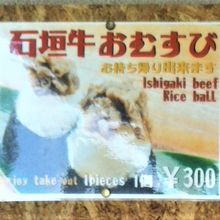 川平公園を散策し公営駐車場に戻ってくると目の前に発見。店外のメニューに「石垣牛おむすび」があったのでテイクアウトで小腹満たしに購入しました。店内は右手がお土産品の売店、左手に食堂となってて、売店には石垣らしい貝や珊瑚を使ったお土産品が揃っています。