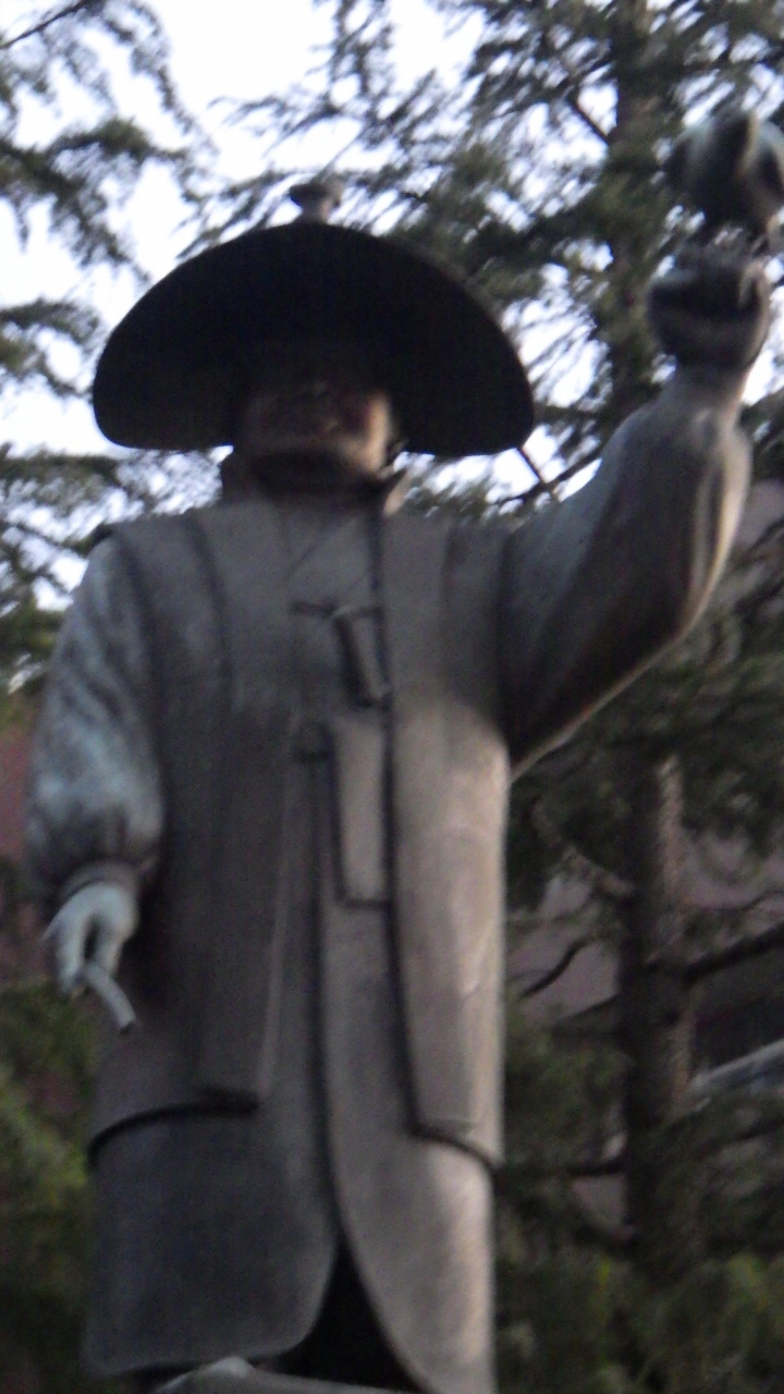 JR両国駅西口から約600m国技館の裏側にある大江戸博物館の横の遊歩道に建つ一見しては徳川家康像とはわからない像が立っています。