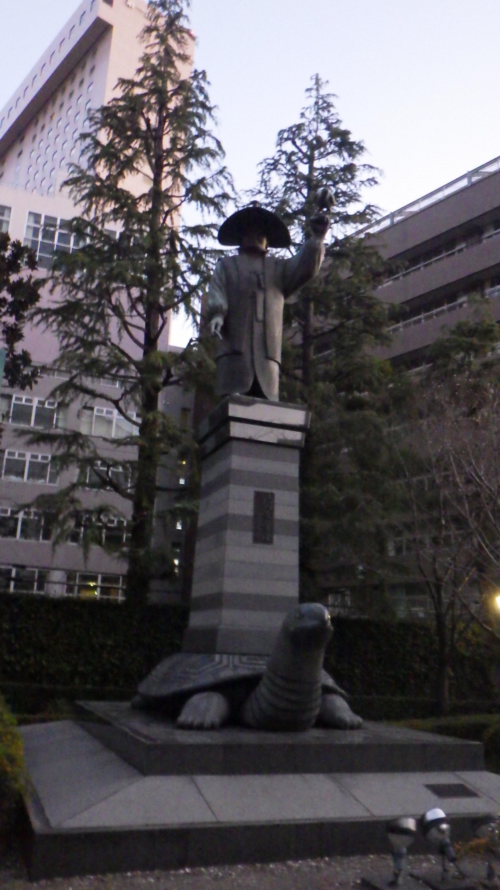 よく見てみると日除けの長い鷹狩用の編み笠をかぶり、羽織姿に手には鷹が止まっている姿だが何故か台座の下に大きなカメがいる、案内板などが見つからないので勝手に想像すると、太平の江戸で大好きな鷹狩をここ両国で楽しんだのでしょう。