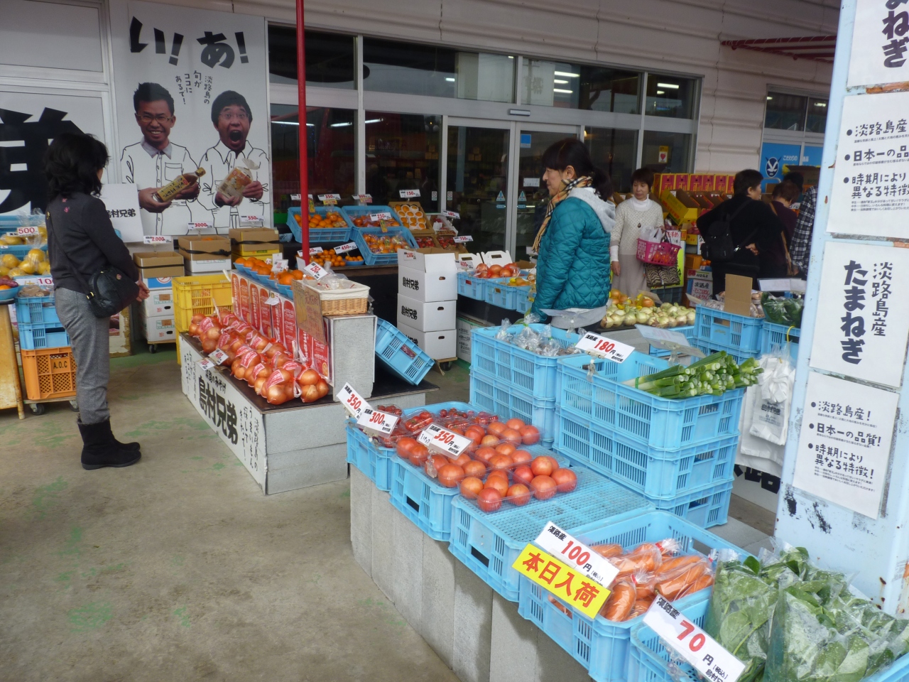 津名ICより降りて、少し東へ進むと左手に赤い屋根が見えてくる。ここが産直淡路島・赤い屋根直売所です。淡路に来ると必ずここによってたまねぎや新鮮な野菜類を買います。入り口では販売をする店員さんたちが手ぐすねを引いていますがそこを通り越し、一番奥の「こだわり屋」という店で買い物をします。ここの亭主は良心的で良し悪しをはっきり言ってくれます。