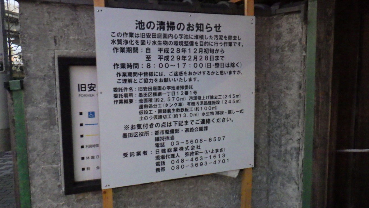 工事予定板によると平成28年12月から平成29年2月末まで、心字池に堆積した汚泥を除去し水質浄化し水生物の環境整備を図るそうです。