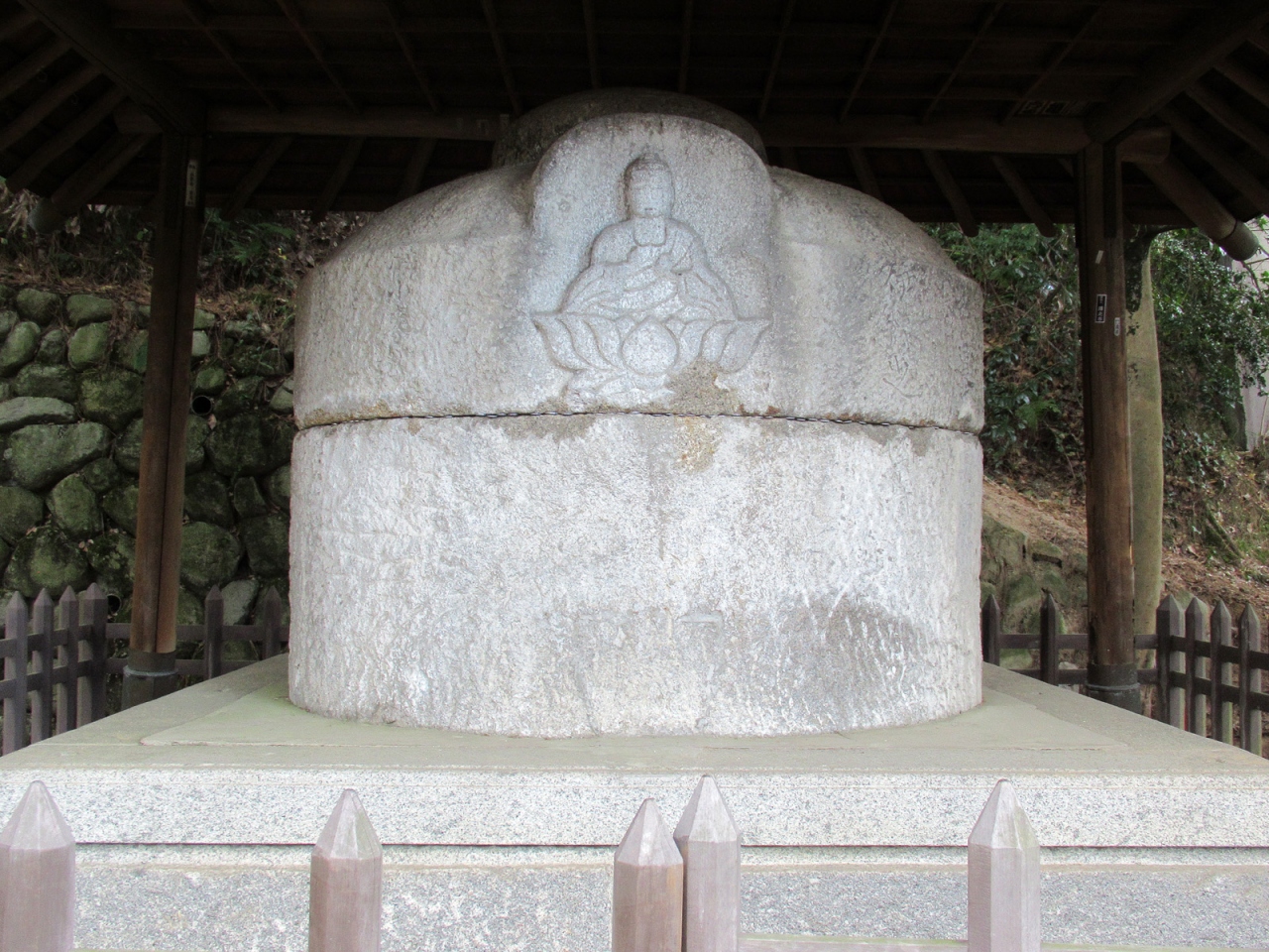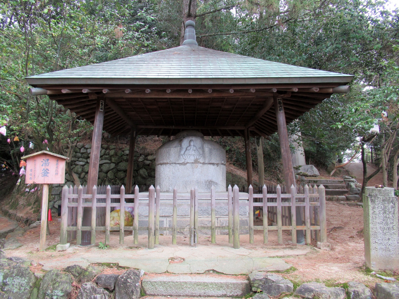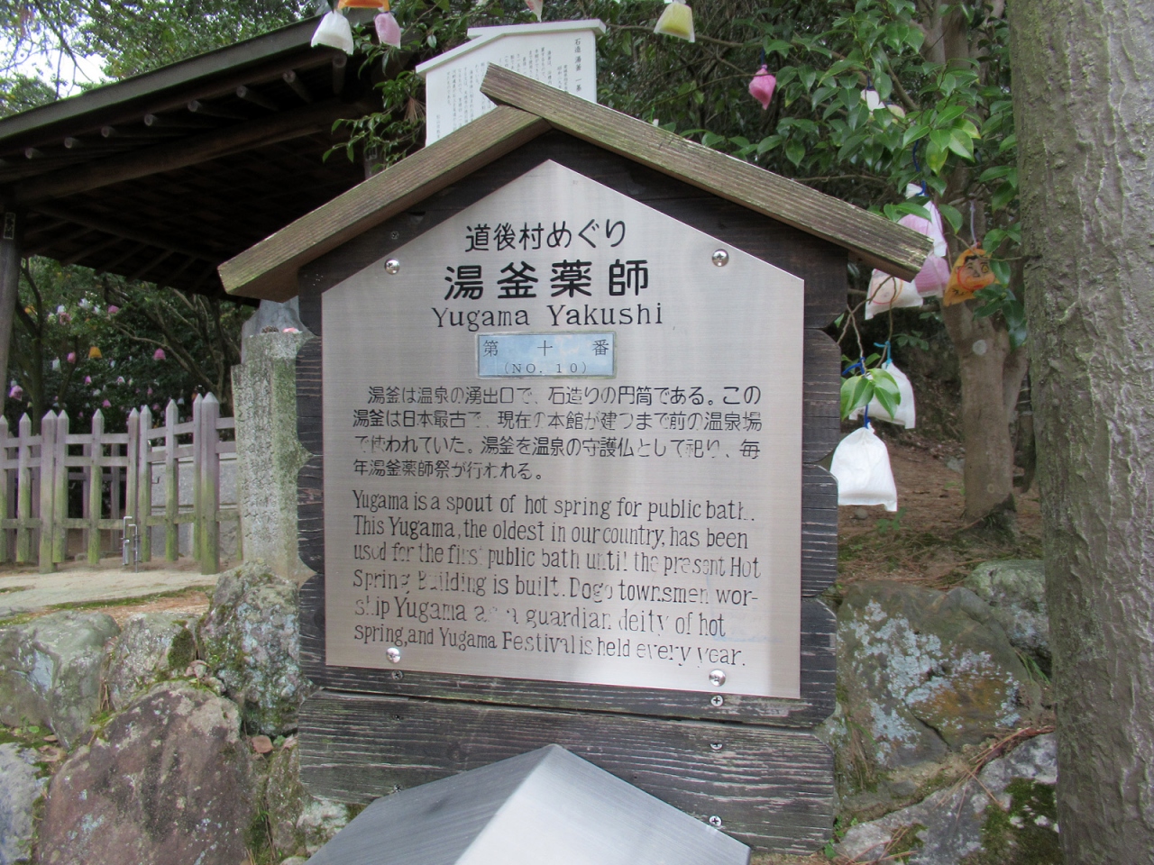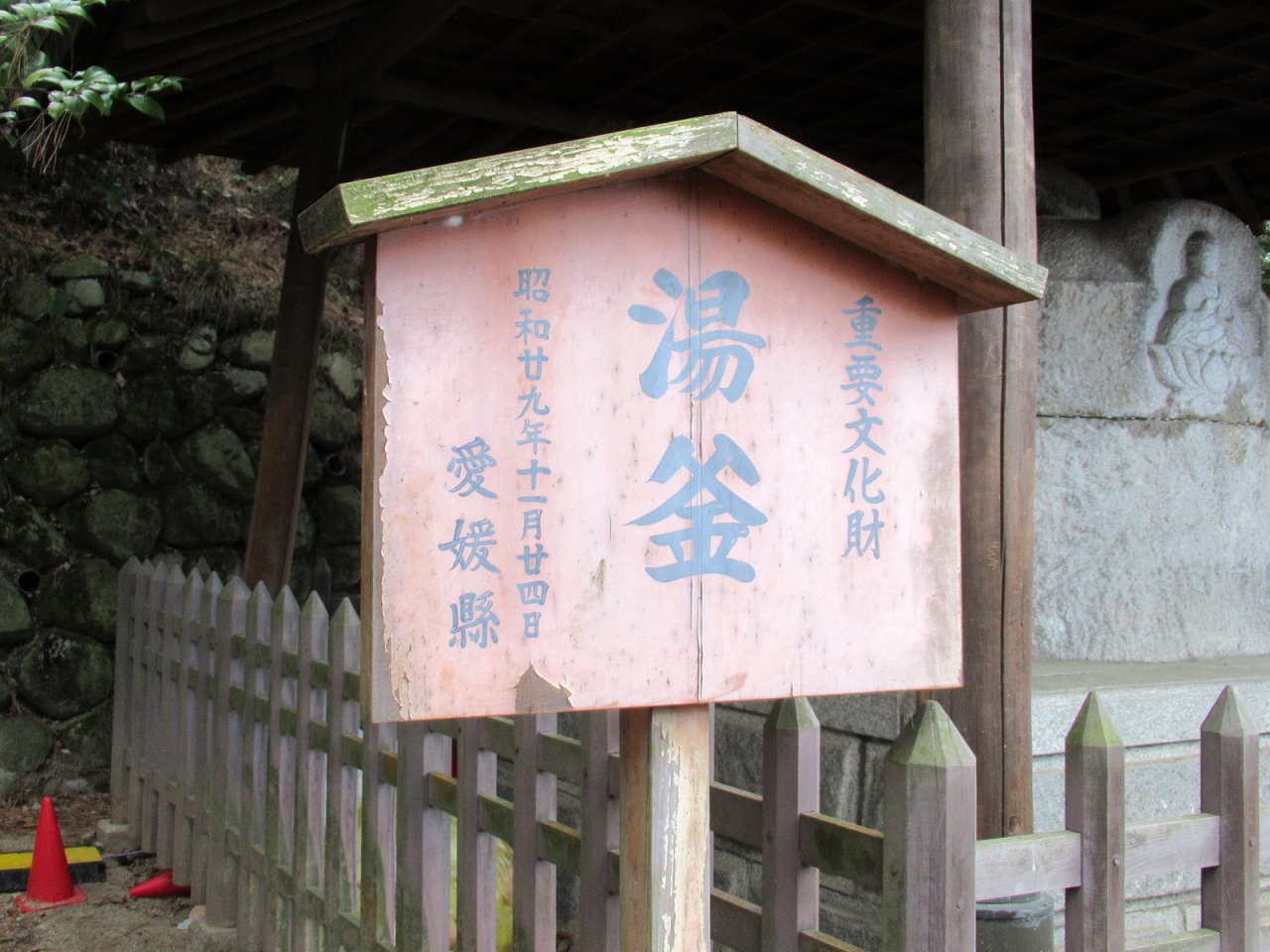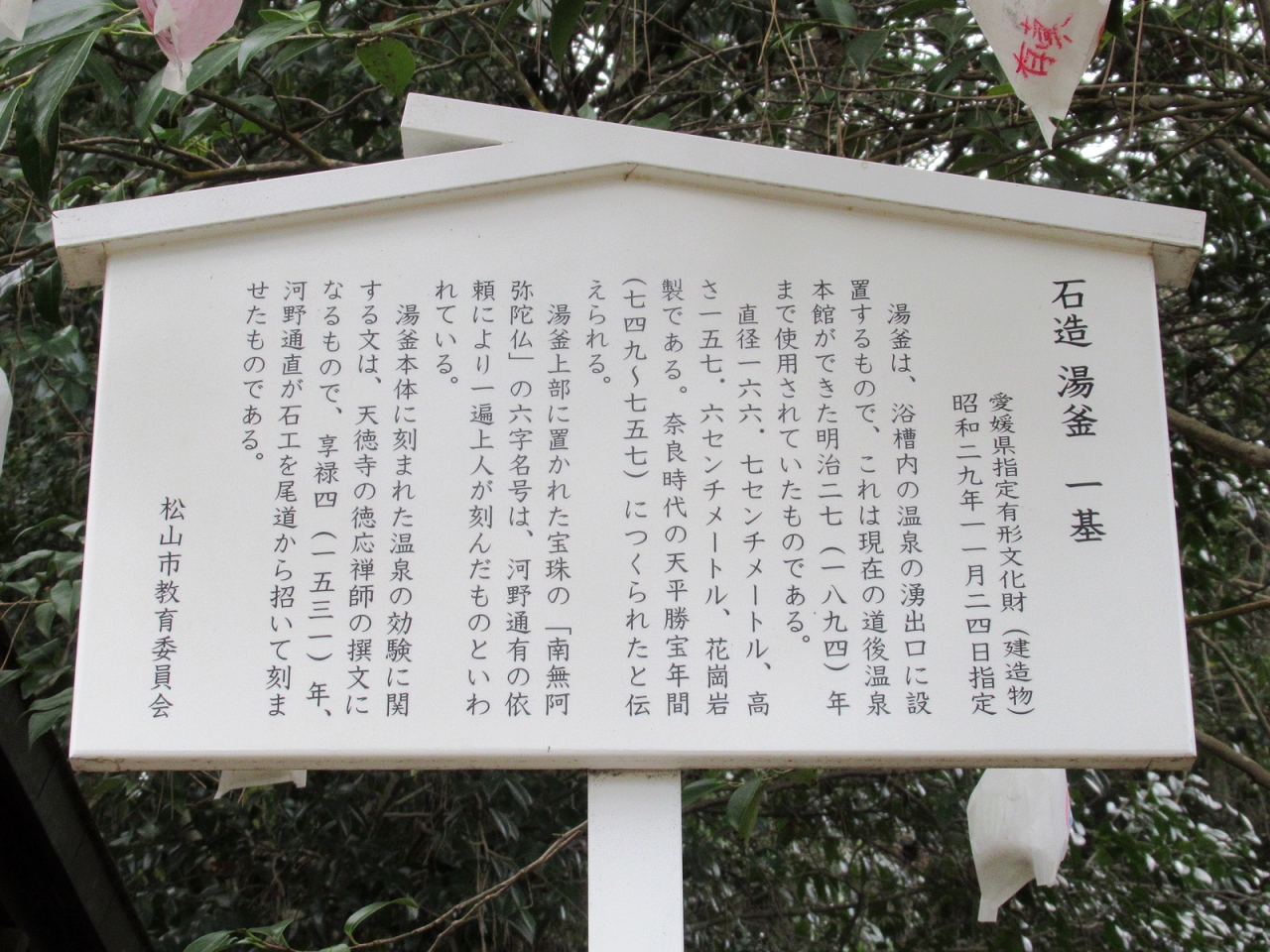 実は湯釜という言葉自体、今回の旅行で初めて知りました。これも旅行の醍醐味ですね。さて「道後公園」内の「湯釜」は、なんと奈良時代に製作されたもので、日本最古とありました。そんな貴重なものが、こんな場所にポツンと置かれていても良いのか?なんて思いました。宝珠部分には一遍上人の「南無阿弥陀仏」の文字があるようなのですが、残念ながら暗くてよく見えませんでした。