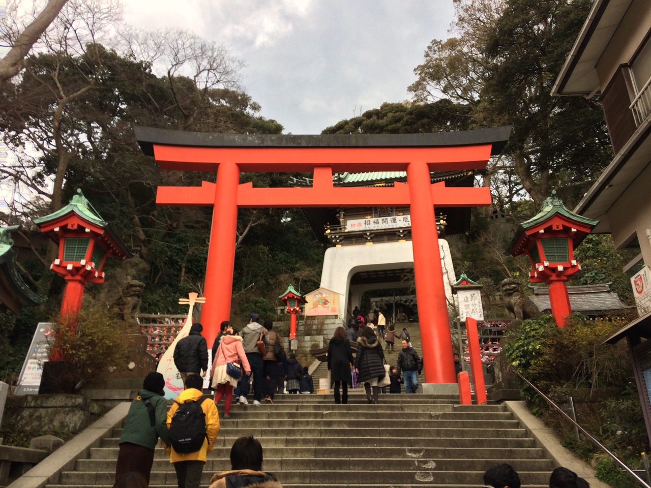 江ノ島大橋を渡って朱の鳥居をくぐり抜け、大いに観光客や参拝客で賑わう仲見世通りを神社に向かって進み、石段の正面の場所にある龍宮城をイメージして造られた楼門です。この楼門付近は行き交う観光客や参拝客がとても多く、さらに急な石段が続くので、日中はここで立ち止まりづらいです。
