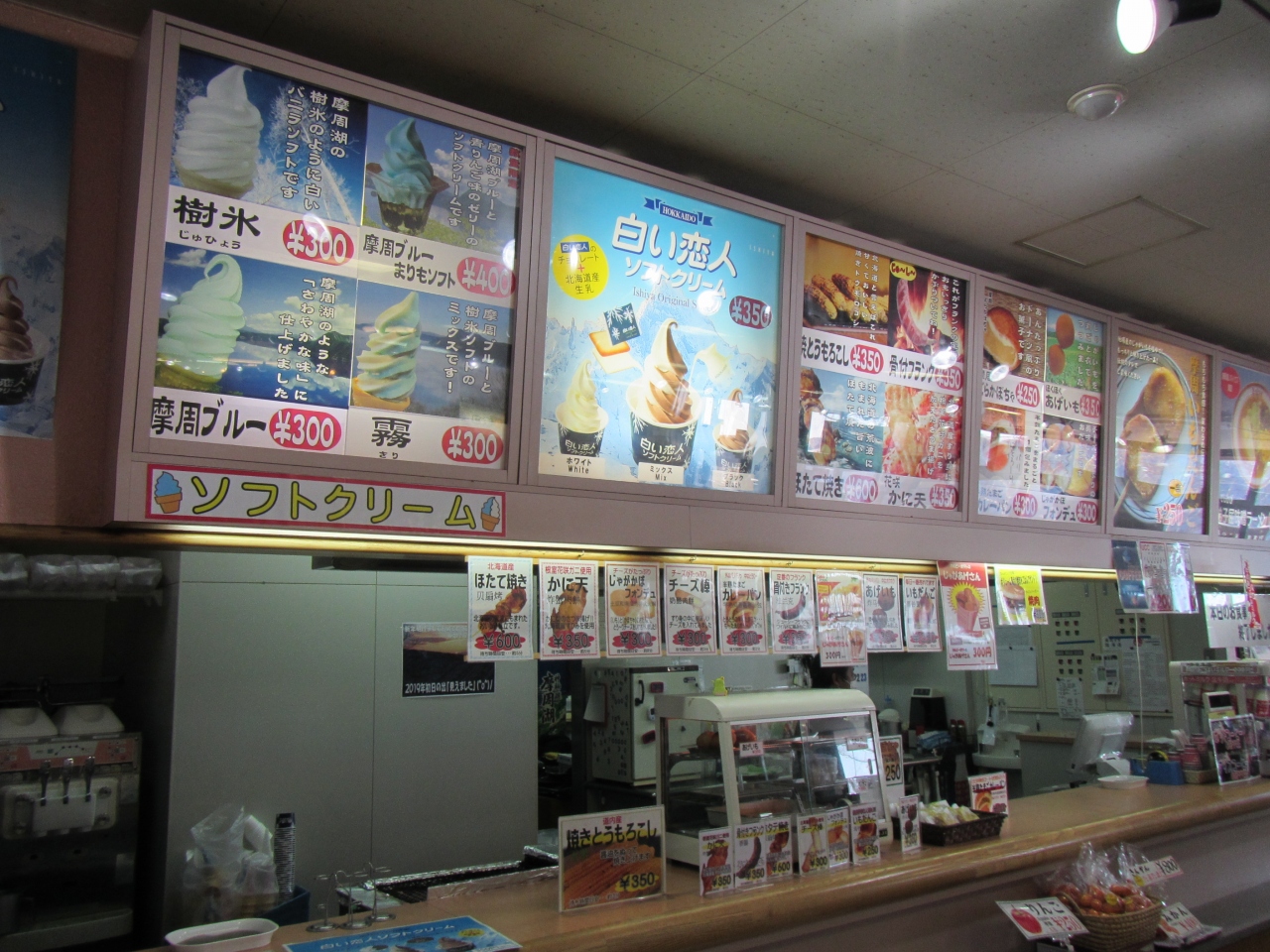 第一展望台では、冬でも温かいレストハウスがあって、8時から18時までの間、営業しており、暖かい室内のテーブル、椅子から座って湖を眺めることもできます。 更に、あげいもや焼きとうもろこし、弟子屈ラーメンなどをいただくことができ、はてさて寒いのにアイスやソフトクリームのような冷たい食べ物まであります。 摩周ブルーという青いソフトクリームは摩周湖を訪れた記念になるのではないでしょうか。