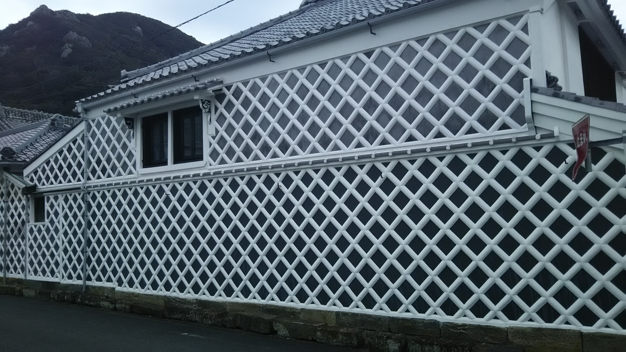 なまこ塀の屋敷です。その壁の白黒のぎざぎざからかなり目立つ存在感抜群の