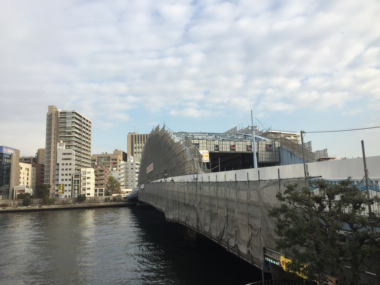 土木学科の学生時代に演習で模型を作った思い出の橋です。隅田川橋梁群の中で重要文化財に指定された橋の一つです。取引先の近くをふらふらしているときに思わず再会しました!今は改修中ですが、長く使われている証拠。いつまでも東京の一部でいてほしい建造物です。