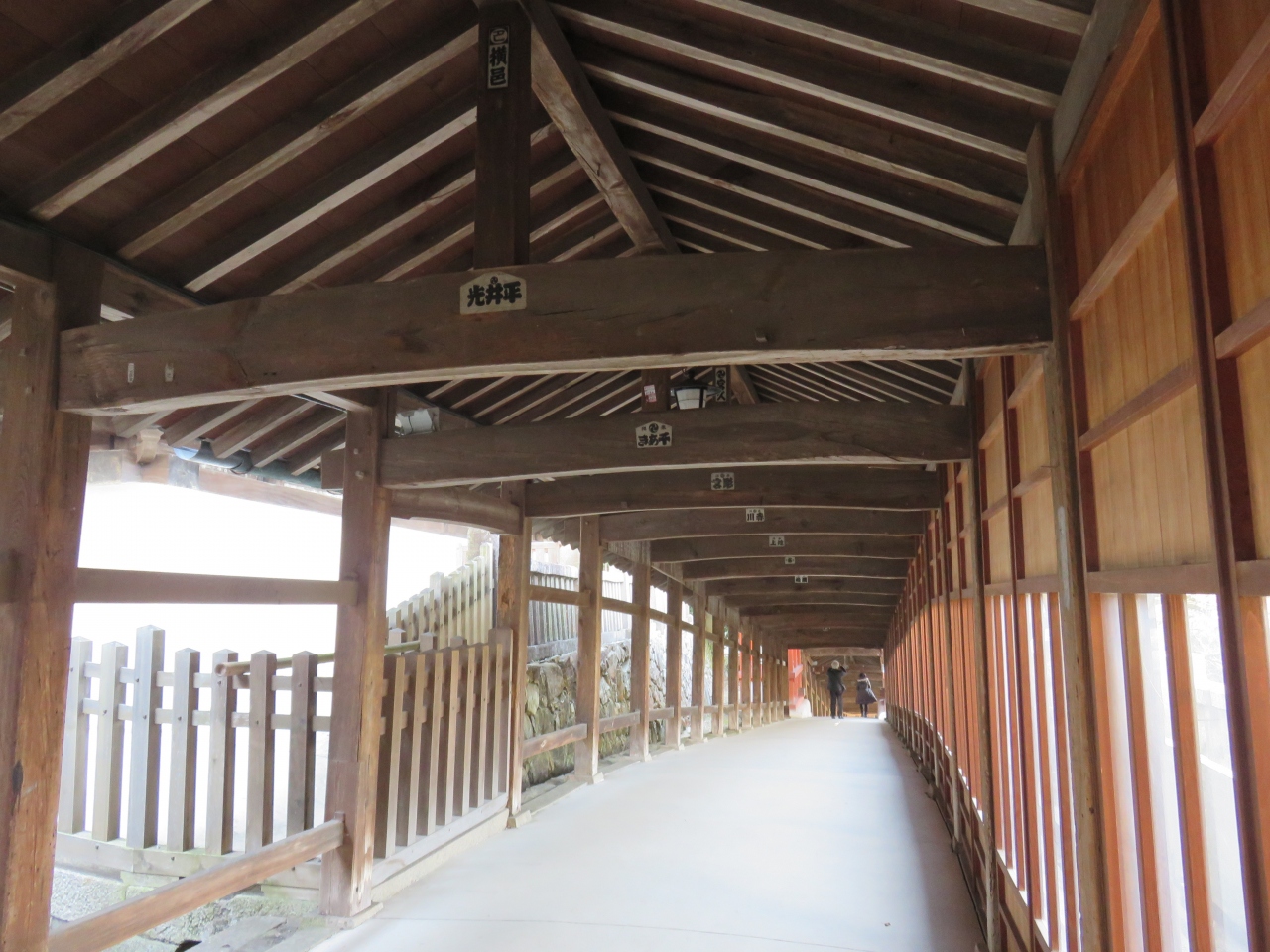 本殿横には南隋神門があり、南隋神門は1357年再建ですが神社最古の建築物で、この門に繋がる回廊は1579年に再建されたようです。南隋神門より斜面になっていますが、奇麗な弧を描いて続く屋根が見事でした。真っすぐ伸びていて奥行き感が凄いと感じました。