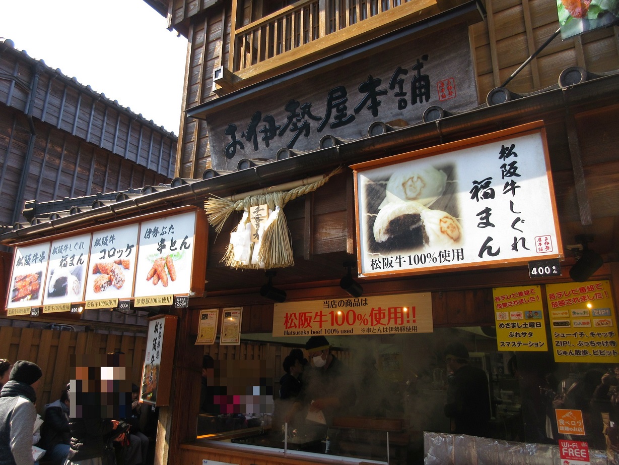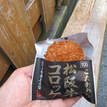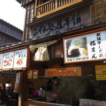 伊勢神宮内宮からほど近い、「おはらい町」に沿って散策した際に立ち寄ったお店です。松坂牛を使った串焼きや、松坂牛コロッケなどが売られていて、どれも食べ歩きできるサイズでした。私は300円の松坂牛コロッケを購入し、お店の左手にあるベンチに腰かけて頂きました。通りは人通りが多く、食べながら歩いていて他の方にあたっては申し訳ないと思いましたので。