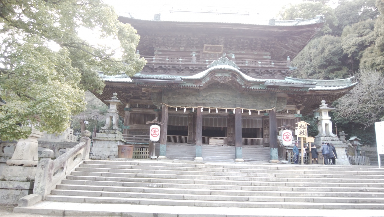 大門から頑張って階段を登っているとやがて立派な社殿が見えてきました。やっとご本宮にたどり着いた・・とかなりの人が思うはず。でも本宮ヘはこれからさらに急な長い階段を登っていかなければなりません。ここまで一杯一杯にになって登ってきた人にとっては心折れる場所です(笑)。