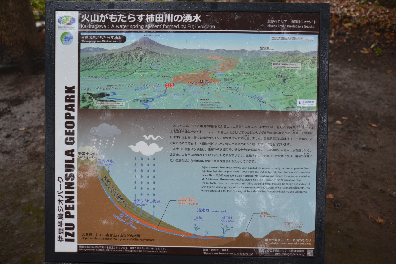 「柿田川公園」は三島市に隣接した清水町にあります。駐車料金は200円です。時期と天候によっては人が少ないです。森の中の歩道を歩いて回れます。途中には水が湧いている水源地が二つあり、展望台も二つあります。富士山からの水が地下を通って湧いているのだそうです。この水を利用してお豆腐をつくって売っている茶屋があります。