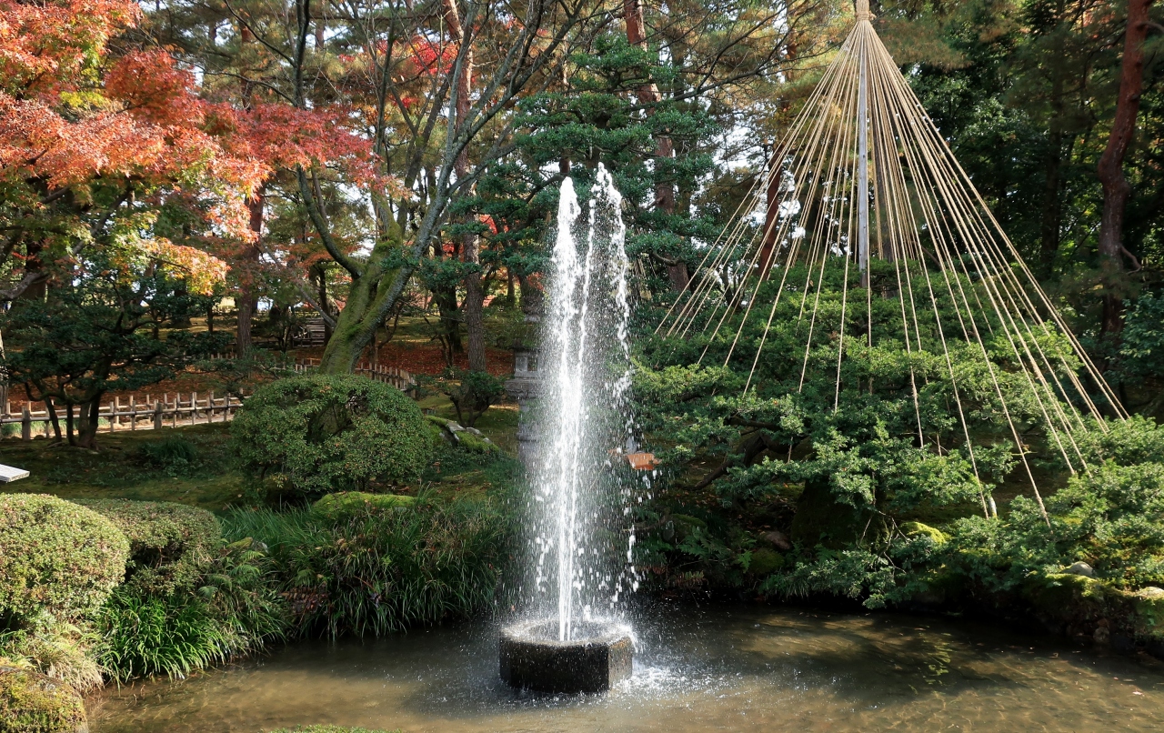 瓢池にある噴水だ。噴水がある所よりも高い位置にある霞ケ池から水を引いており、噴水との高低差を利用した自然の水圧で水を噴き上げる。幕末の1861(文久元)年に造られた日本最古とされる噴水だ。金沢城内の二ノ丸に水を引くために試作された装置と伝えられており、水の高さは通常約3・5メートルある。華やかさはないが、和風、わびさびの噴水という趣がある。