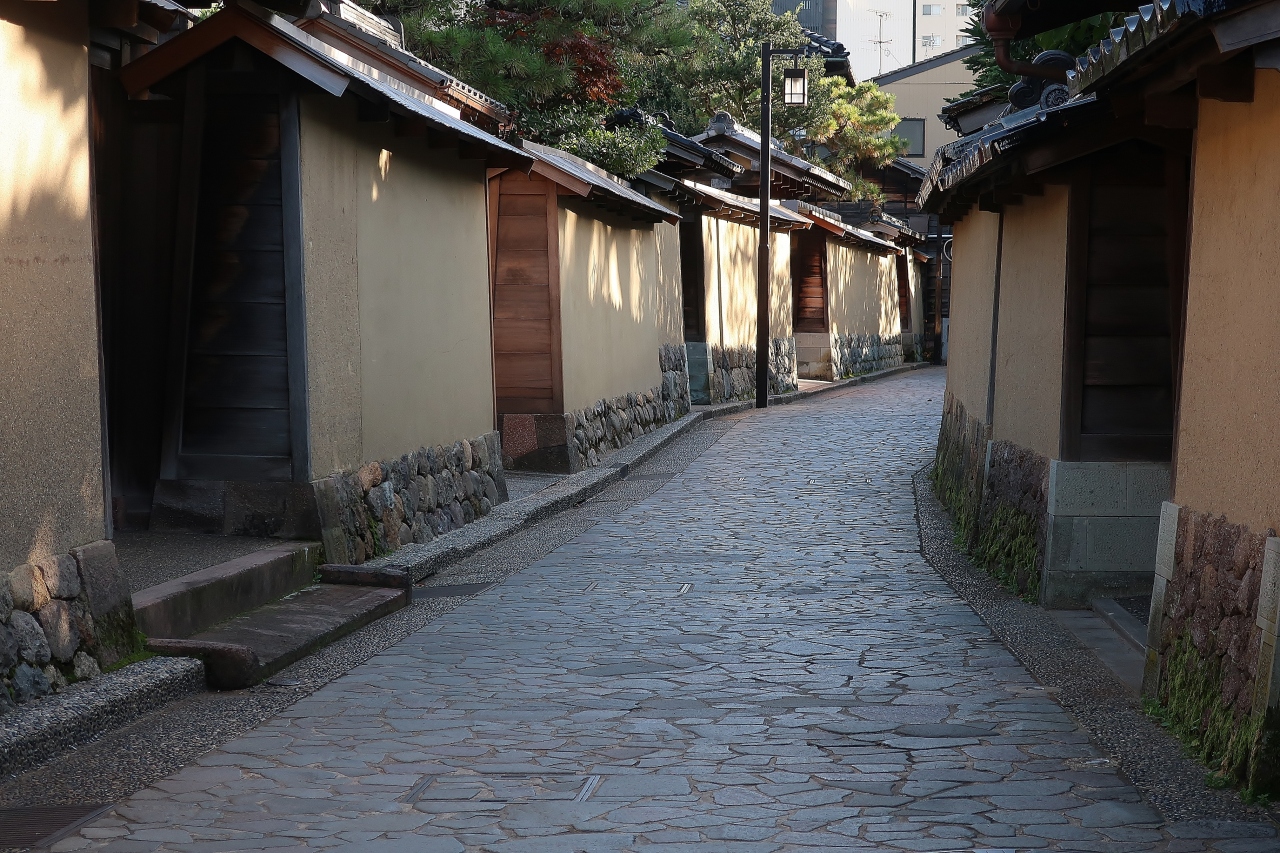 武家屋敷が連続して残っているまちは全国に数多くあるが、金沢はそのうちでも飛び抜けて有名だ。昔のまま残っているというよりも、点的な保存ではなく面的な保存がうまくいっているからだ。長町武家屋敷跡の土塀はその面的な保存がうまくいっている好例だろう。風水思想の影響だと思うが、黄土色の壁がずっと続くさまは面的保存の最たるものだし、色彩も景観の重要な要素なのだとあらためて教えてくれる。城下町の道は少し曲がったり、交差点が食い違ったりと防御策の名残が残っているものだが、金沢の土塀もそうだ。現地では「曲がり真っすぐ」というらしい。曲がり真っすぐな土塀は武家屋敷群を代表する景観なのだ。
