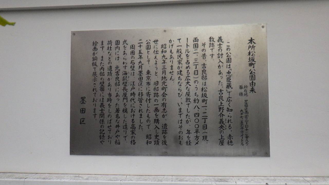 海鼠壁にある案内板によると、江戸時代は吉良家の上屋敷であったが明治以降、一般民家が建てられその面影が失われつつあったが昭和9年に地元町内会の有志が遺跡を後世に伝えようと一角を購入し整備して東京都に寄付した公園との事です。