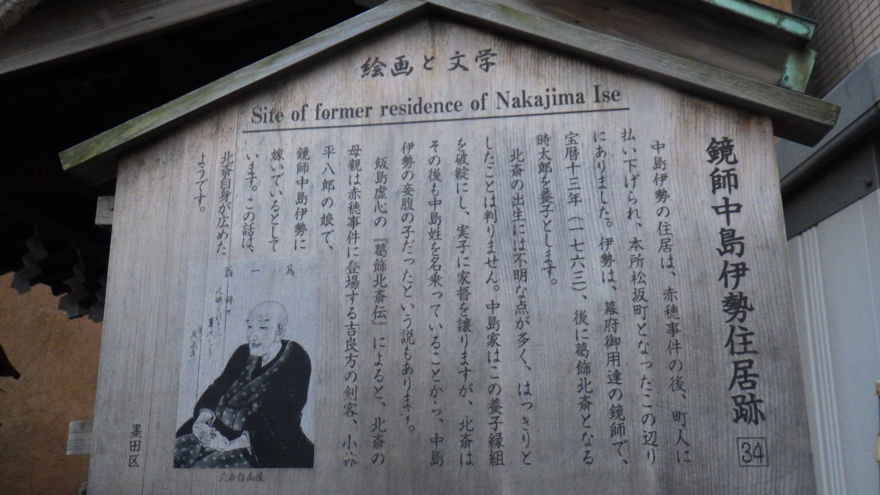 高札型案内板によると、中島伊勢の住宅跡で伊勢は幕府御用達の鏡師であり葛飾北斎の幼少期養子とした家で、北斎の母は飯島虚心の葛飾北斎伝によると吉良上野介家臣小林平八郎の娘ということなどが書かれています。