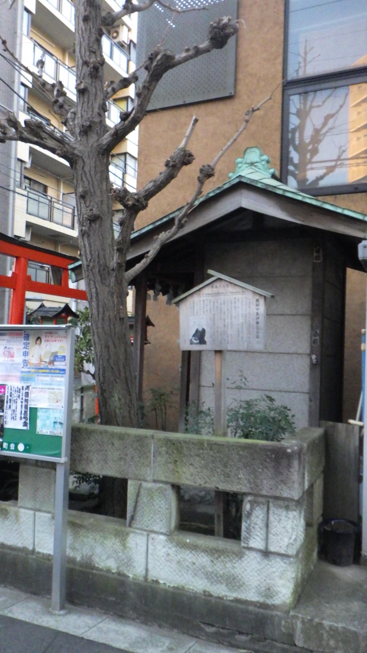JR両国駅西口を出て南へ500m位、京葉道路を渡って進むと静かな住宅や事務所などが多い区域に瓦葺き白壁の海鼠塀に囲まれた吉良邸跡の向かい側にある飯澄稲荷神社境内に立てられています。
