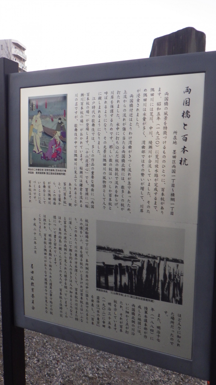 江戸時代の隅田川は荒川、中川、綾瀬川が合流して東京湾にそそぐ川で水量、湾曲部が多くその勢いで川岸が浸食され、武蔵国と下総国の間に架かる両国橋は破損や流失等が絶えなかったため護岸の補強と流失を防ぐために百本に及ぶ杭を打たれたそうです。