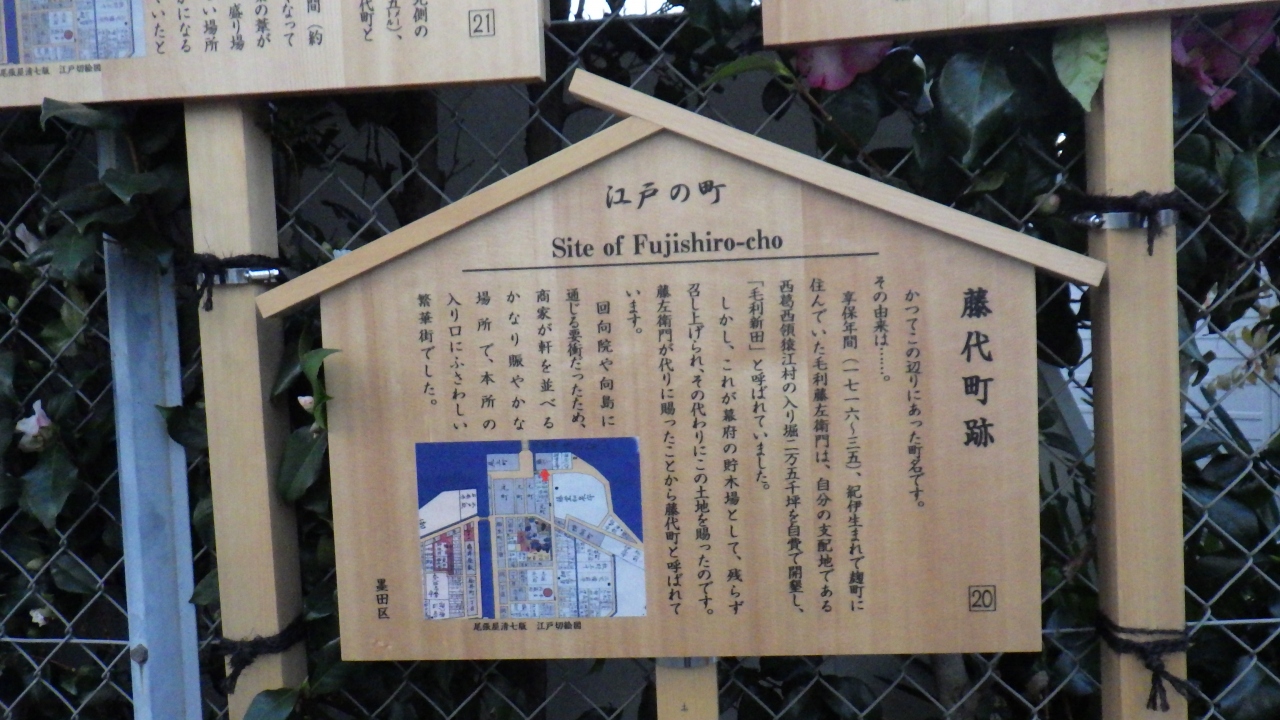 武蔵国と下総国両国の間を流れる隅田川に架かる両国橋の袂にある児童公園内に立てられている高札型案内板によると、この辺りのかつての町名で、麹町に住んでいた毛利藤左衛門が開墾した入り堀を、幕府に召し上げられその代わりにこの地を賜ったので、藤左衛門が代わりに賜ったことから藤代町と呼ばれたそうです。