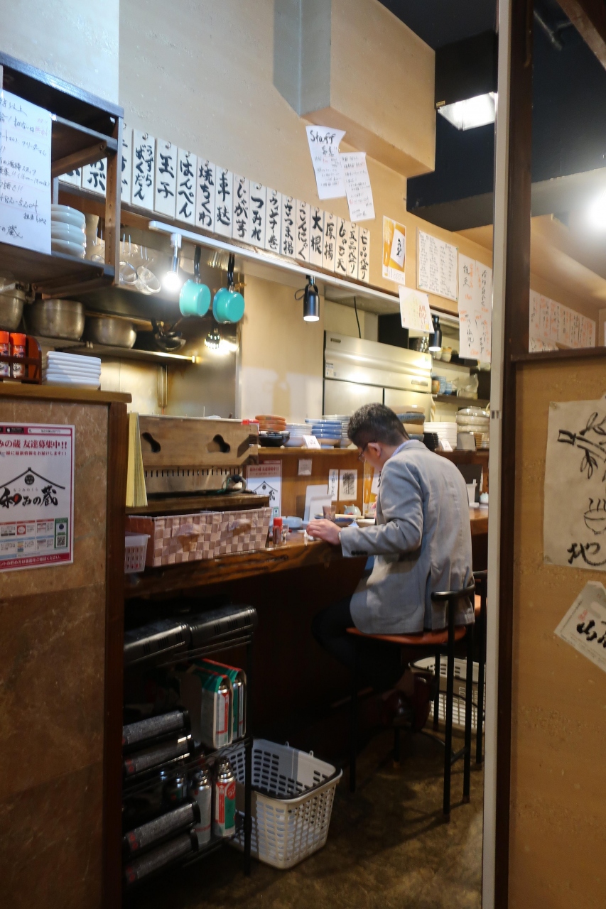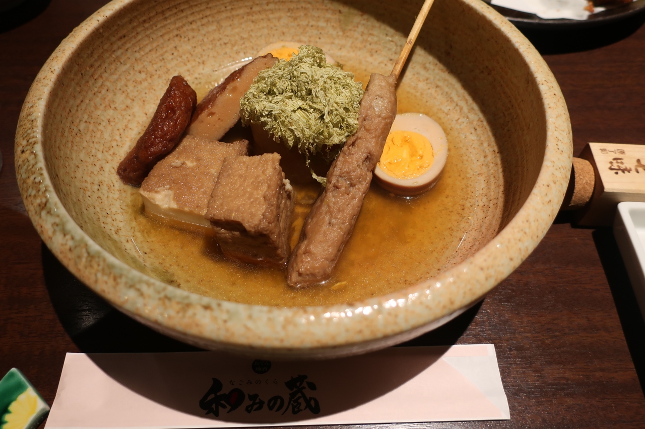青葉台駅から環状4号線を十日市場方面に歩き246のガードを潜った先に和みの蔵があります。おでんがメインの居酒屋で、店内はカウンター席と座敷テーブルの席があります。おでんはじっくり煮込んだおでんで、薬味に辛子の他、柚子胡椒、黒七味で頂けます。おでん意外にも揚げ物、焼き物、刺身、サラダなどの料理もあり、食事もOK。
