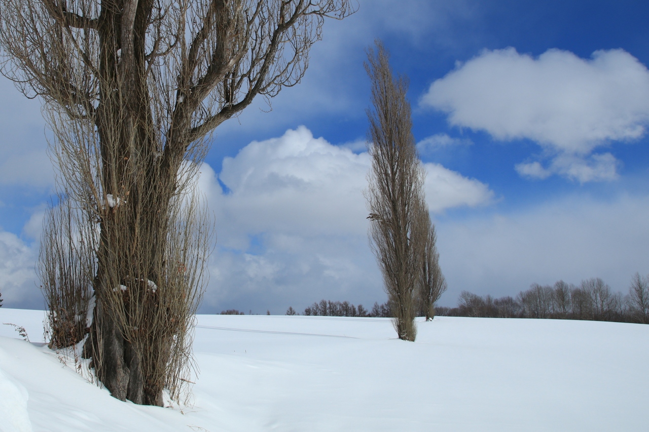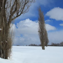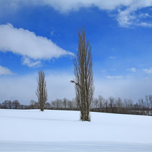 丘の上に立つ数本の木が美しく、それまで雪がふっていたところから一時的に晴れて、青空の下まさに絶景でした。