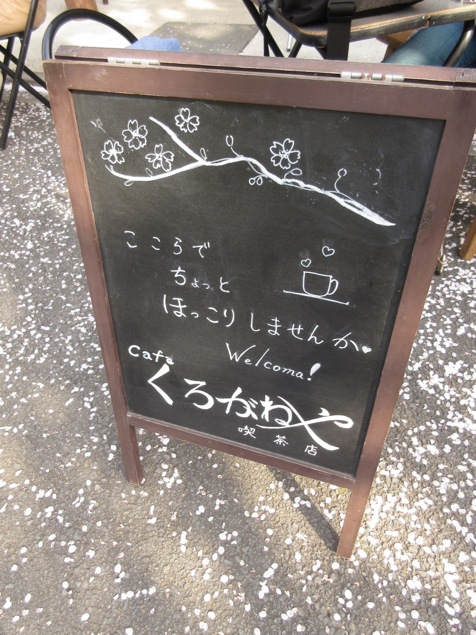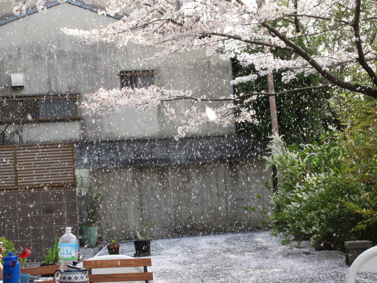 ちょっと休憩してビールでも飲もうと立ち寄り、店の外のテーブル席に陣取りましたが、桜吹雪が目の前で見えて絶好のポジション!