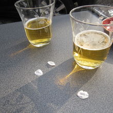 テーブルにも散った花びらが舞い落ち、ビールがより一層おいしくなりました。