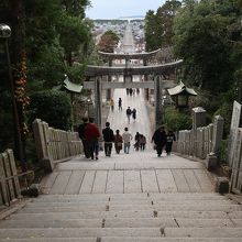 古賀ICから20分程の福津市にある神社です。嵐が出演したJALのCMで光の道が紹介されたことで人気となっています。訪れた日は少し曇り気味でしたが、石段の先に玄界灘まで延びる参道の眺めが見事です。夕日に真っ赤に染まるときは、さぞ人気だろうと思います。